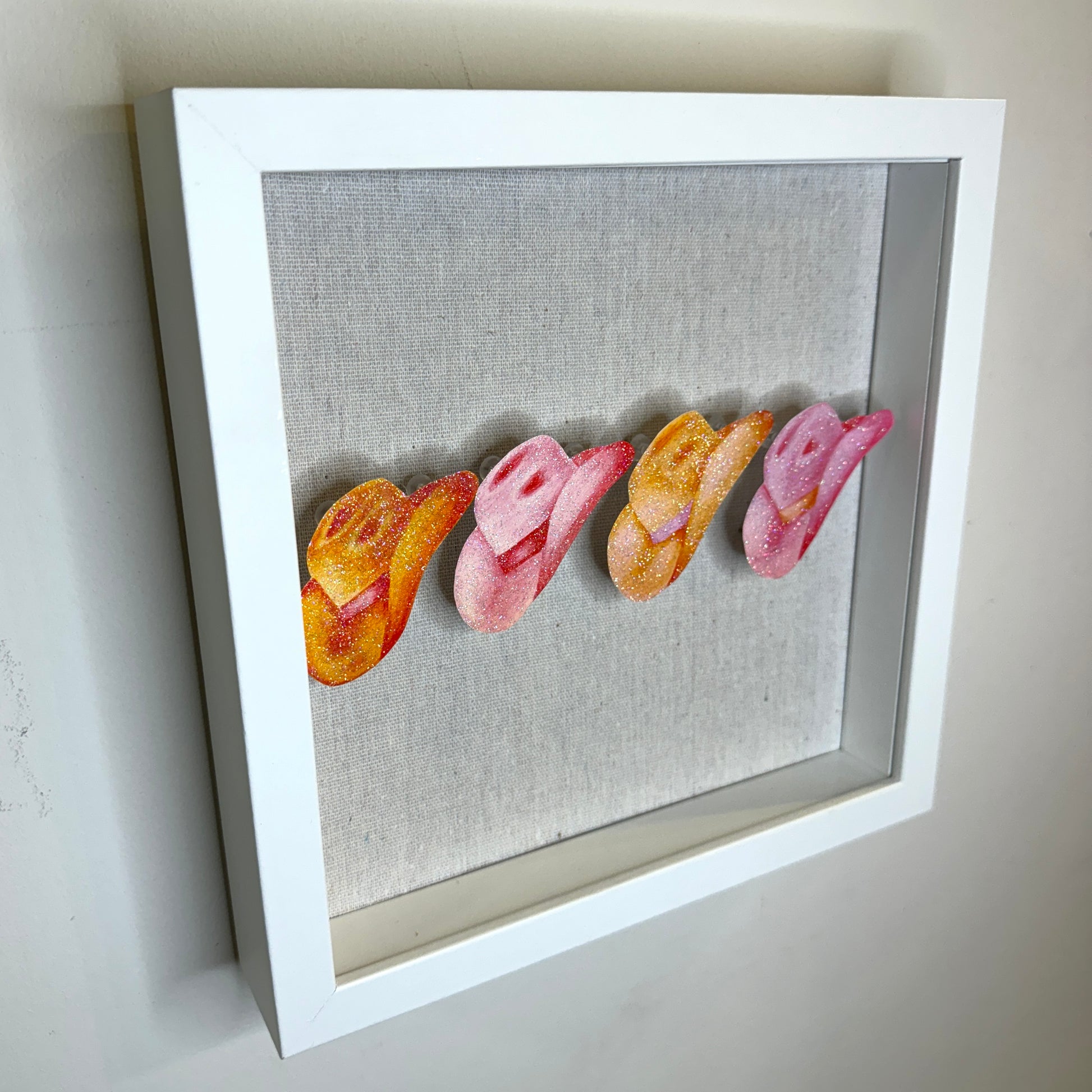 One of Audrey’s most popular watercolors reimagined. Each cowboy hat is embellished by hand with ultra-fine iridescent glitter that shines with tiny hints of color. Sealed with an acrylic gloss to minimize shedding and adhere to a fabric covered board