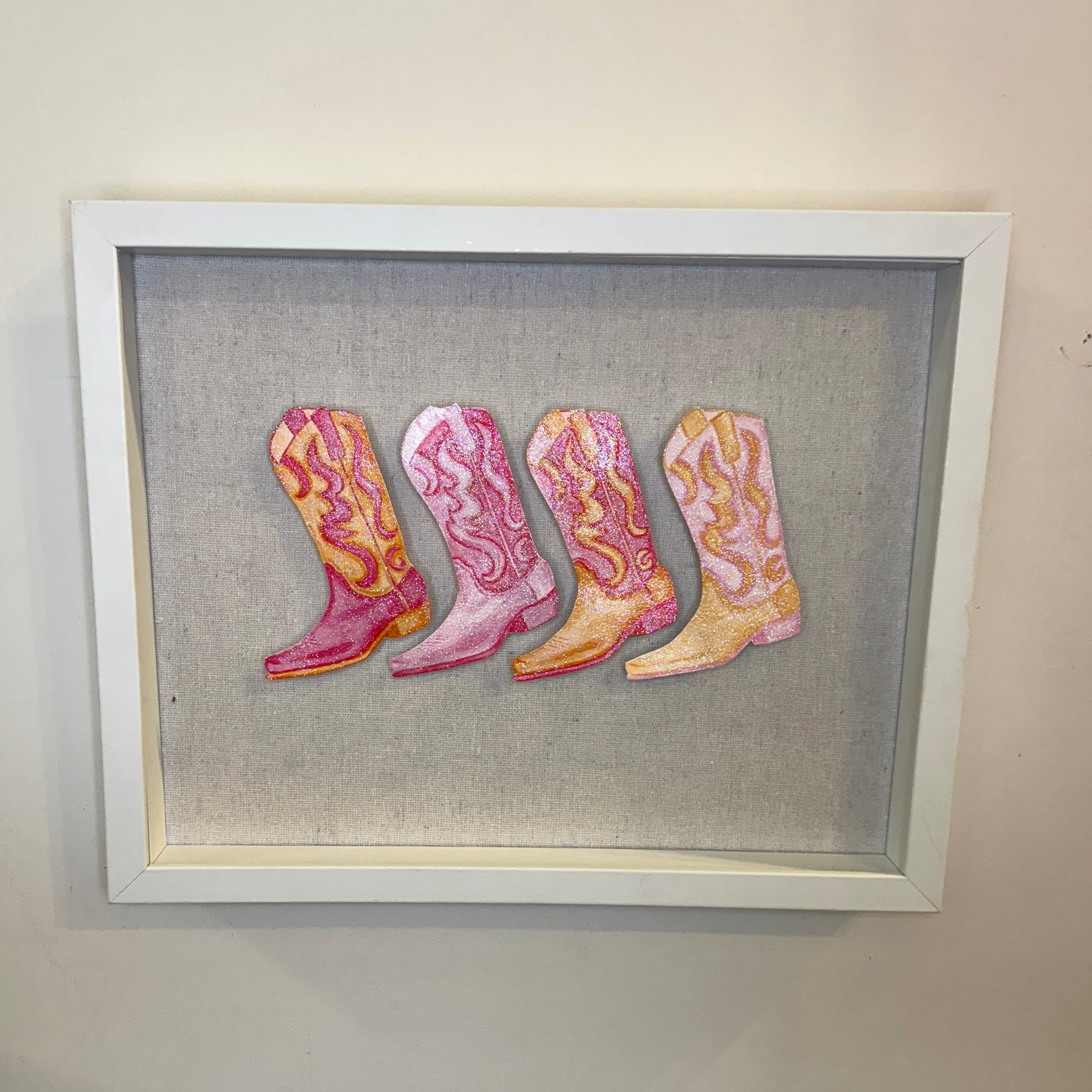 One of Audrey’s most popular watercolors reimagined. Each cowboy boot is embellished by hand with ultra-fine iridescent glitter that shines with tiny hints of color. Sealed with an acrylic gloss to minimize shedding and adhere to a fabric covered board
