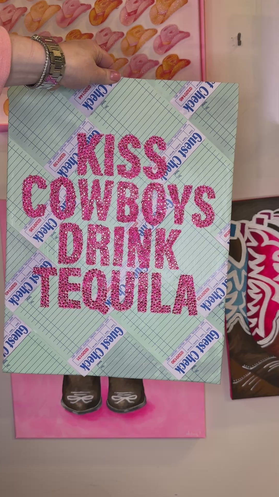 Add some honky-tonk glam to your walls with this bold mixed media art piece! Featuring sparkly pink rhinestone text over vintage guest checks, this “Kiss Cowboys Drink Tequila” design is perfect for country girls, bachelorette parties, bar carts, or any space that needs a little yeehaw energy and rhinestone sparkle.
