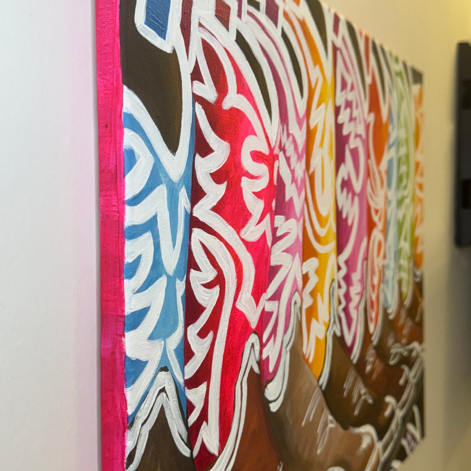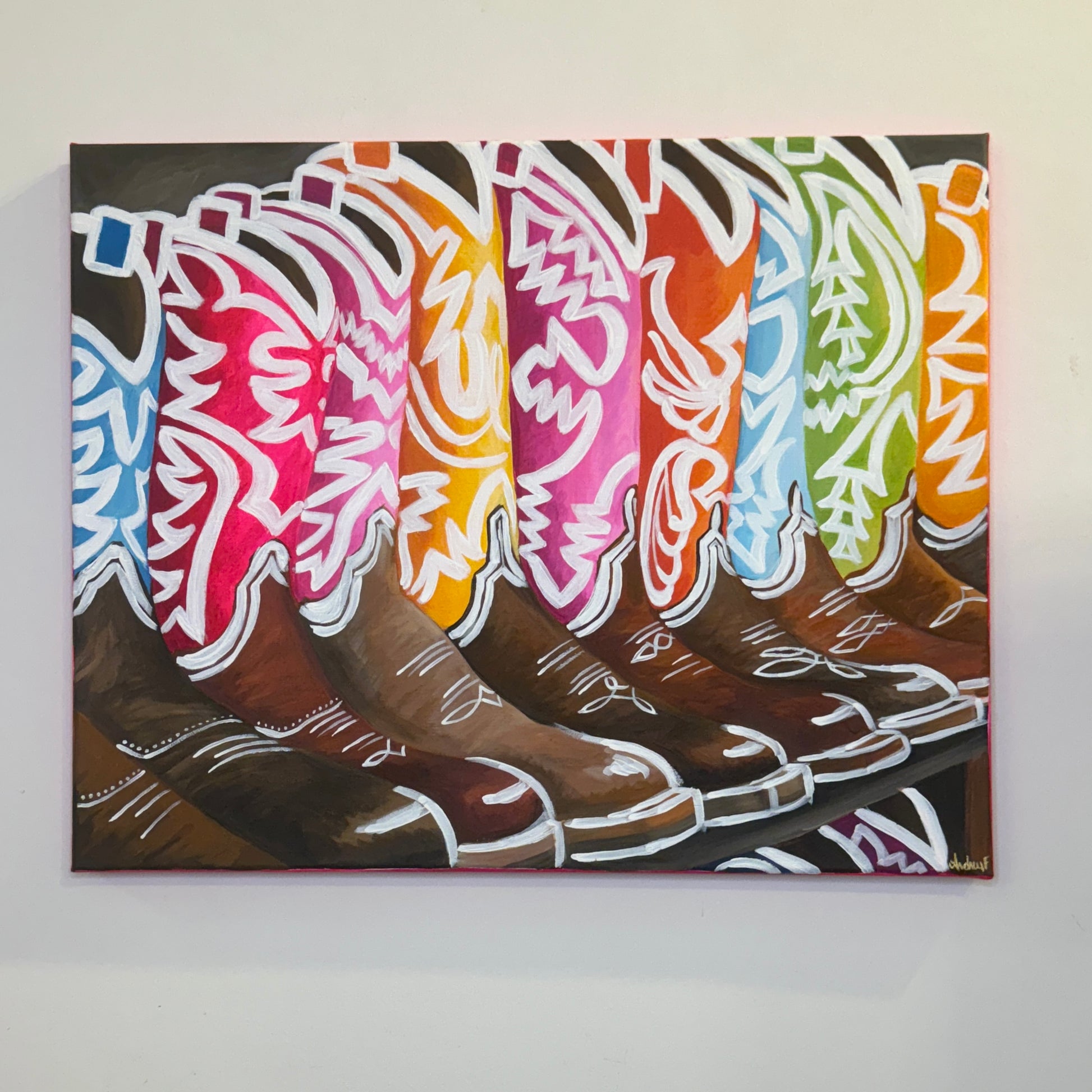 Bring bold western charm and vibrant personality into your home with this hand-painted 16”x20” acrylic on canvas artwork featuring a striking lineup of colorful cowboy boots. Each boot is painted in rich, eye-catching hues — from hot pink and tangerine to turquoise and lime green — with detailed western stitching that adds movement and texture.