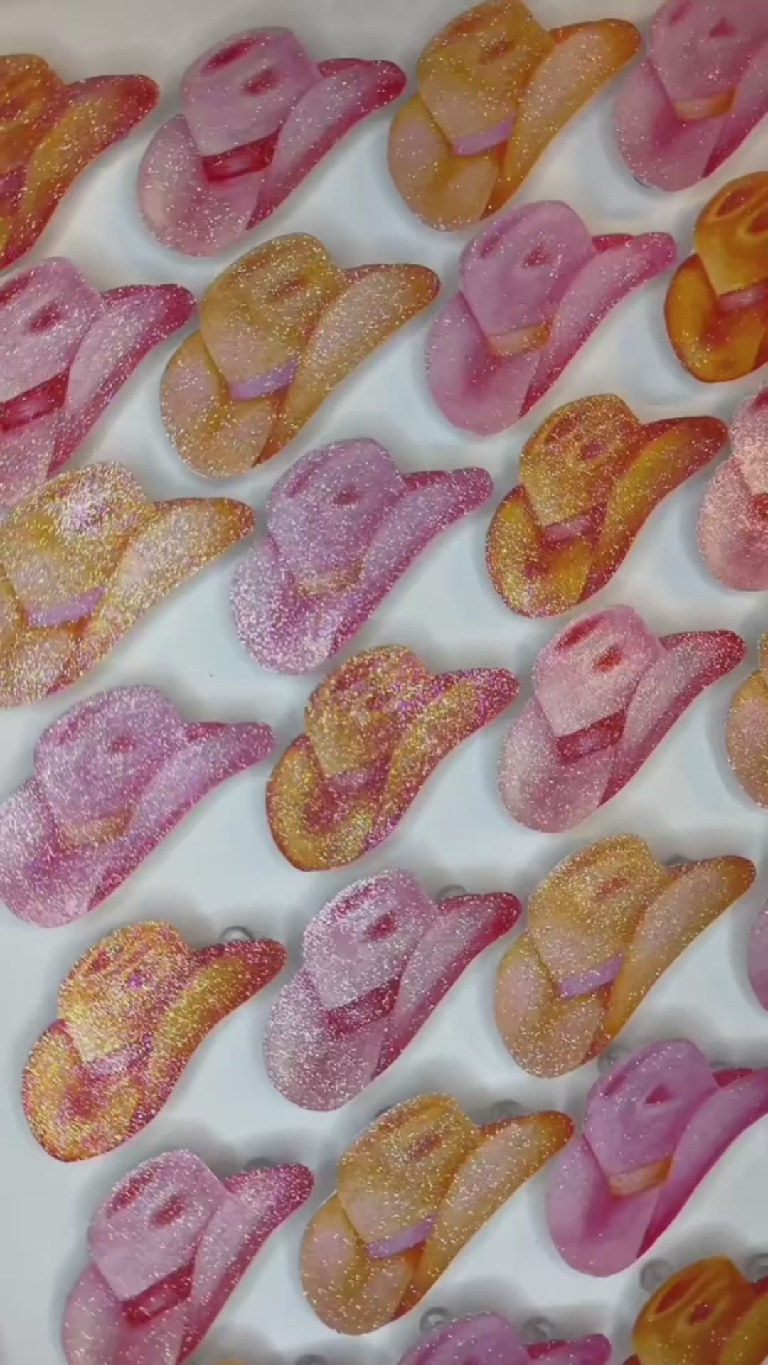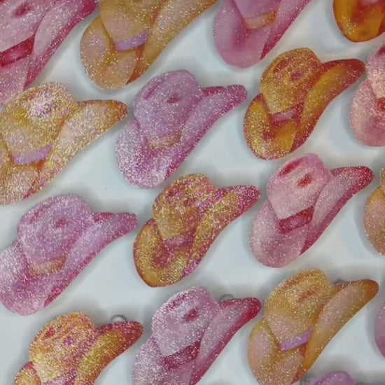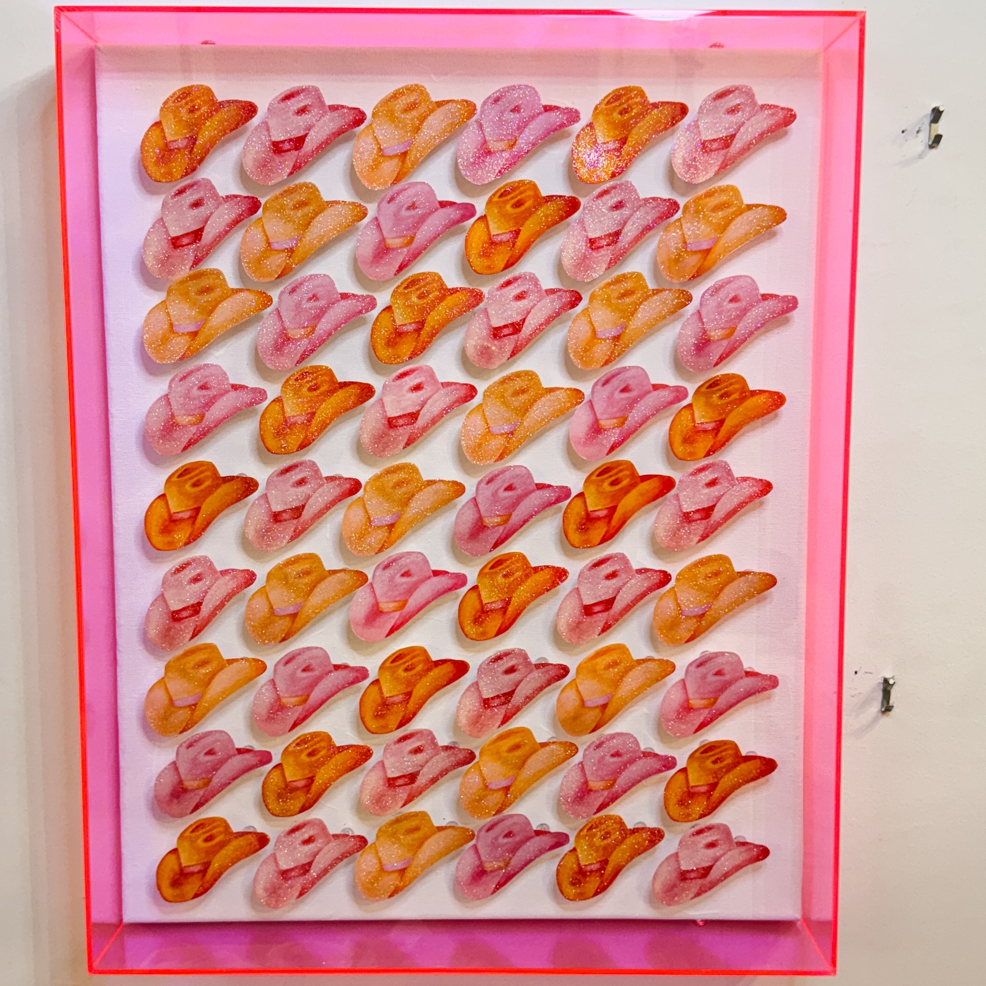 16” x 20” Glitter Embellished Watercolor Hot Pink & Orange Cowboy Hats 3D Push Pin Shadow Box Holographic Hot Pink