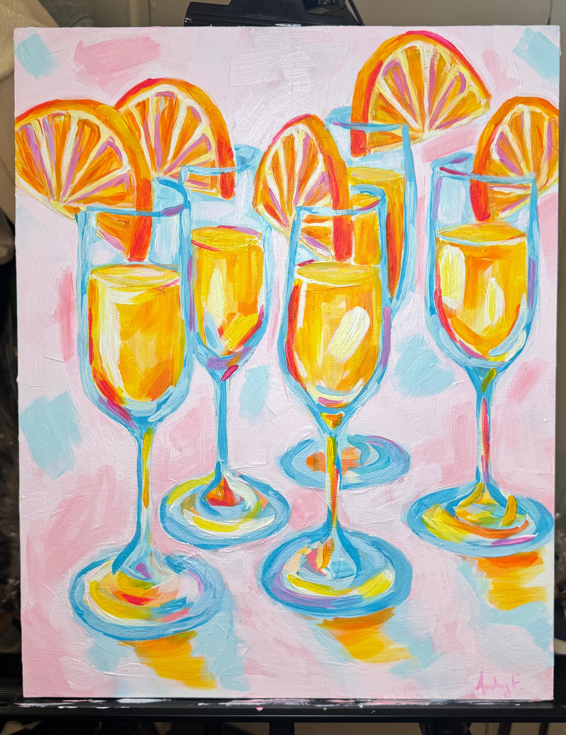Celebrate brunch in style with this one-of-a-kind 16x20 acrylic on canvas painting featuring vibrant mimosa cocktails. Hand-painted with bold brushstrokes in warm yellows, oranges, and pinks, and accented with cool blues for contrast, this artwork brings energy, color, and joy to any space. Each champagne flute is topped with a fresh orange slice, making it a perfect centerpiece for kitchens, dining rooms, or home bar areas.