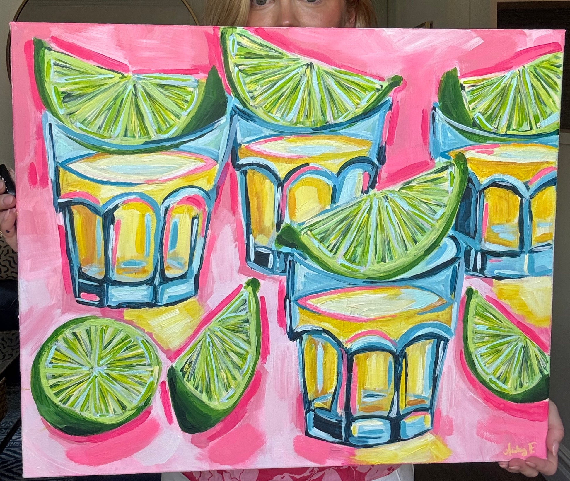 Add a bold splash of fun to your space with this original 20”x24” acrylic painting on stretched canvas, featuring vibrant tequila shots topped with juicy lime wedges. Set against a hot pink background, the colorful brushstrokes and playful composition bring instant energy and personality—perfect for anyone who loves a good cocktail and a bold aesthetic.
