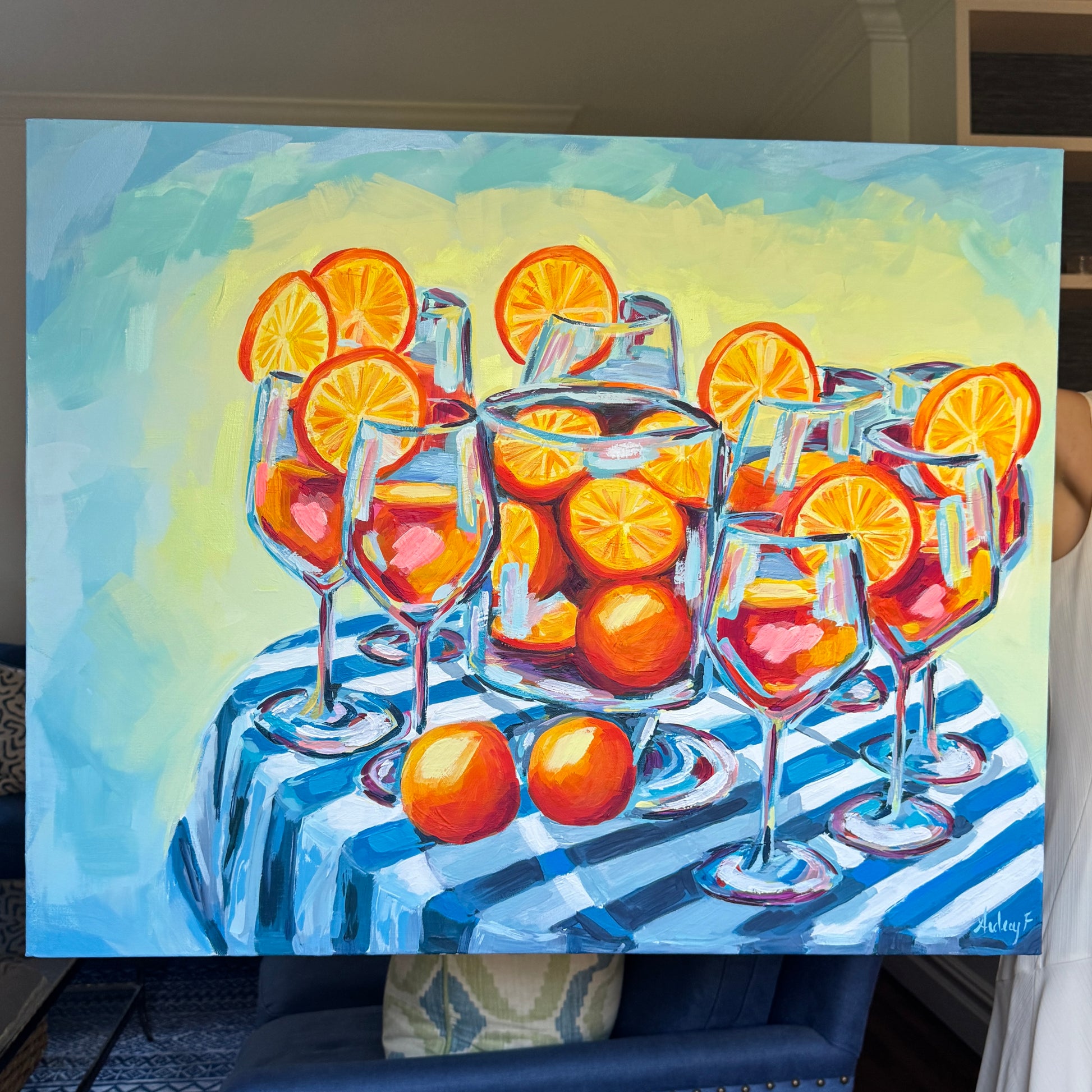 Celebrate the joy of Spritz Season with this vibrant original acrylic painting inspired by the iconic Aperol Spritz. A festive lineup of spritz-filled glasses and a citrus-packed pitcher sit atop a bold blue striped tablecloth, evoking seaside afternoons, aperitivo hours, and endless summer gatherings.