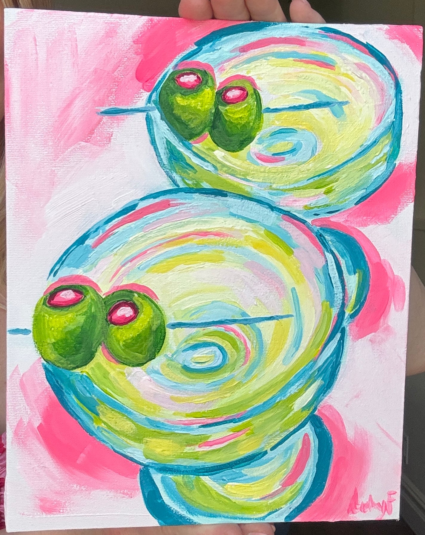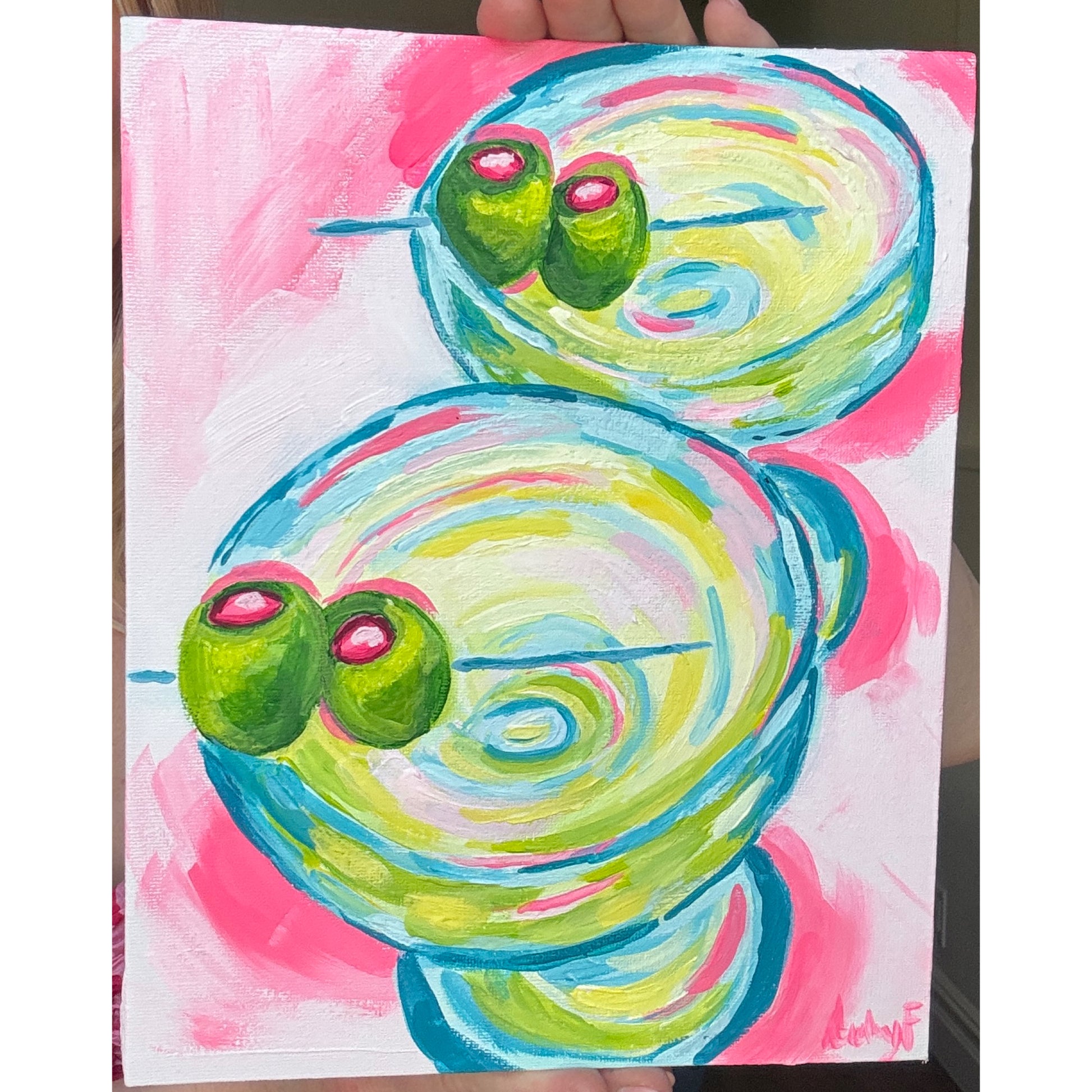 Make it a double! This vibrant acrylic painting features two bold martini glasses with bright green olives, swirling with neon pink, lime green, aqua blue, and yellow. Hand-painted in an expressive, abstract style, this 8”x10” canvas brings instant energy and retro charm to any space.