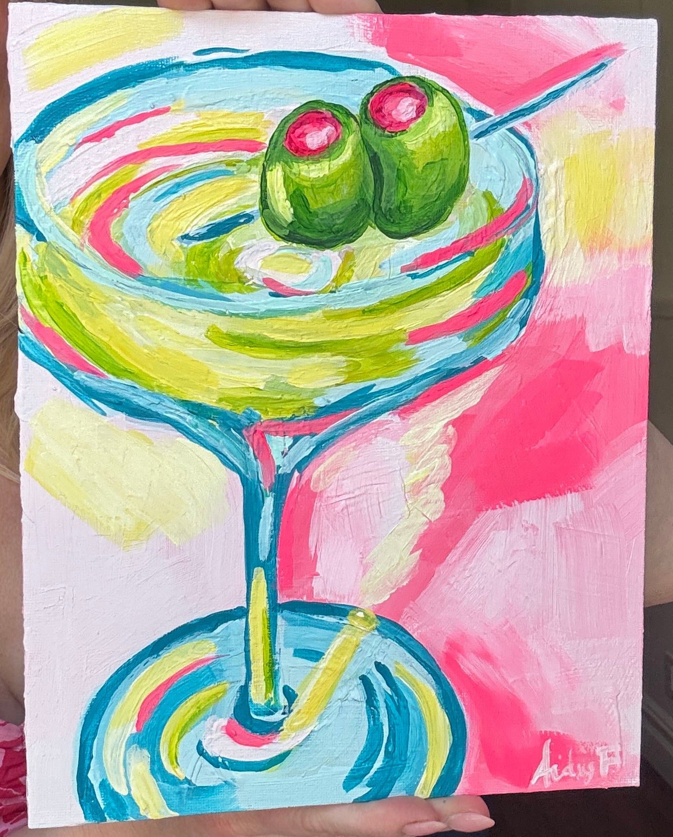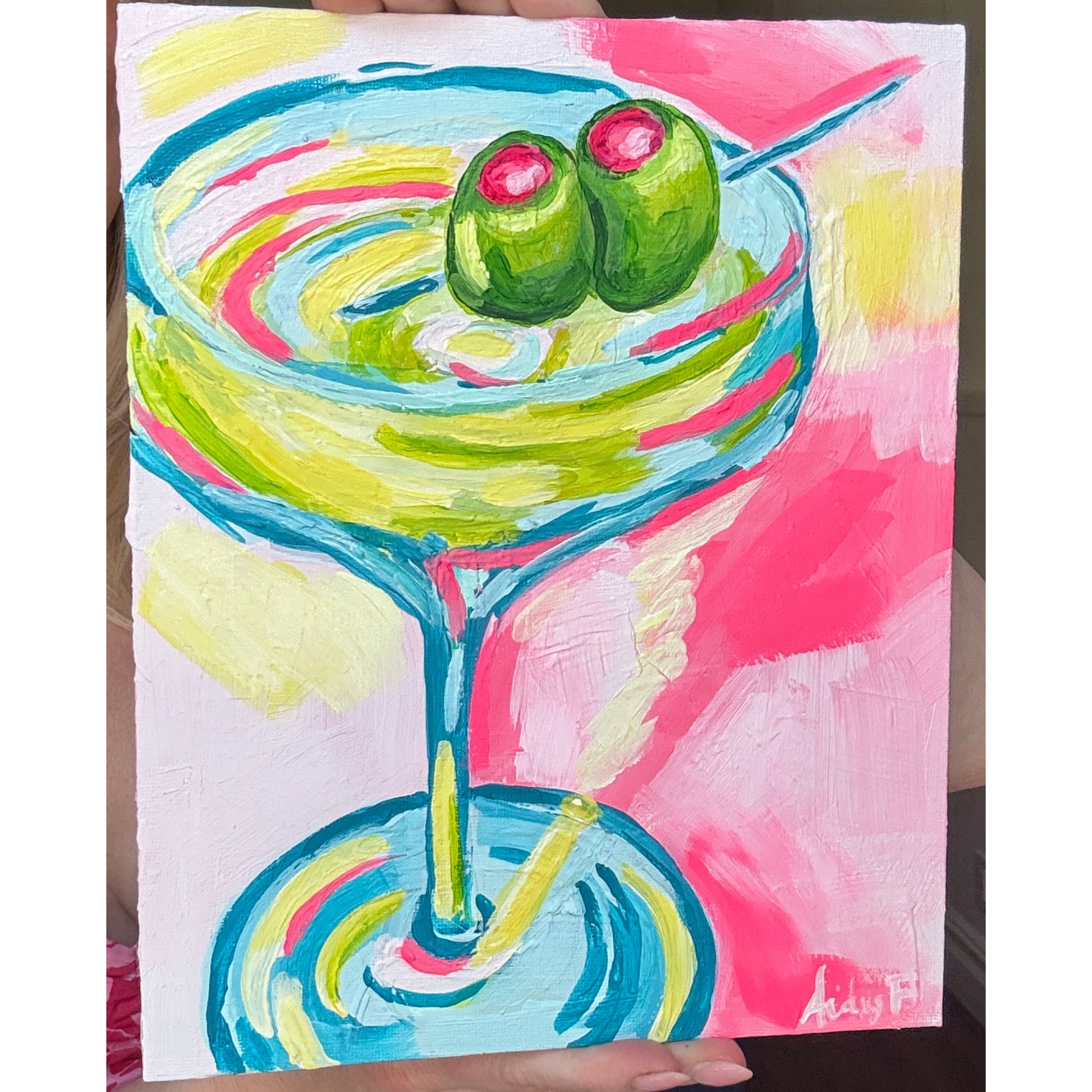 Bold, bright, and ready to party—this abstract martini glass painting features a vivid swirl of neon lime green, aqua blue, and punchy pink, with two juicy green olives front and center. Hand-painted on canvas, this one-of-a-kind 8”x10” artwork adds a playful, retro-chic pop to bar carts, kitchen walls, or gallery-style displays.
