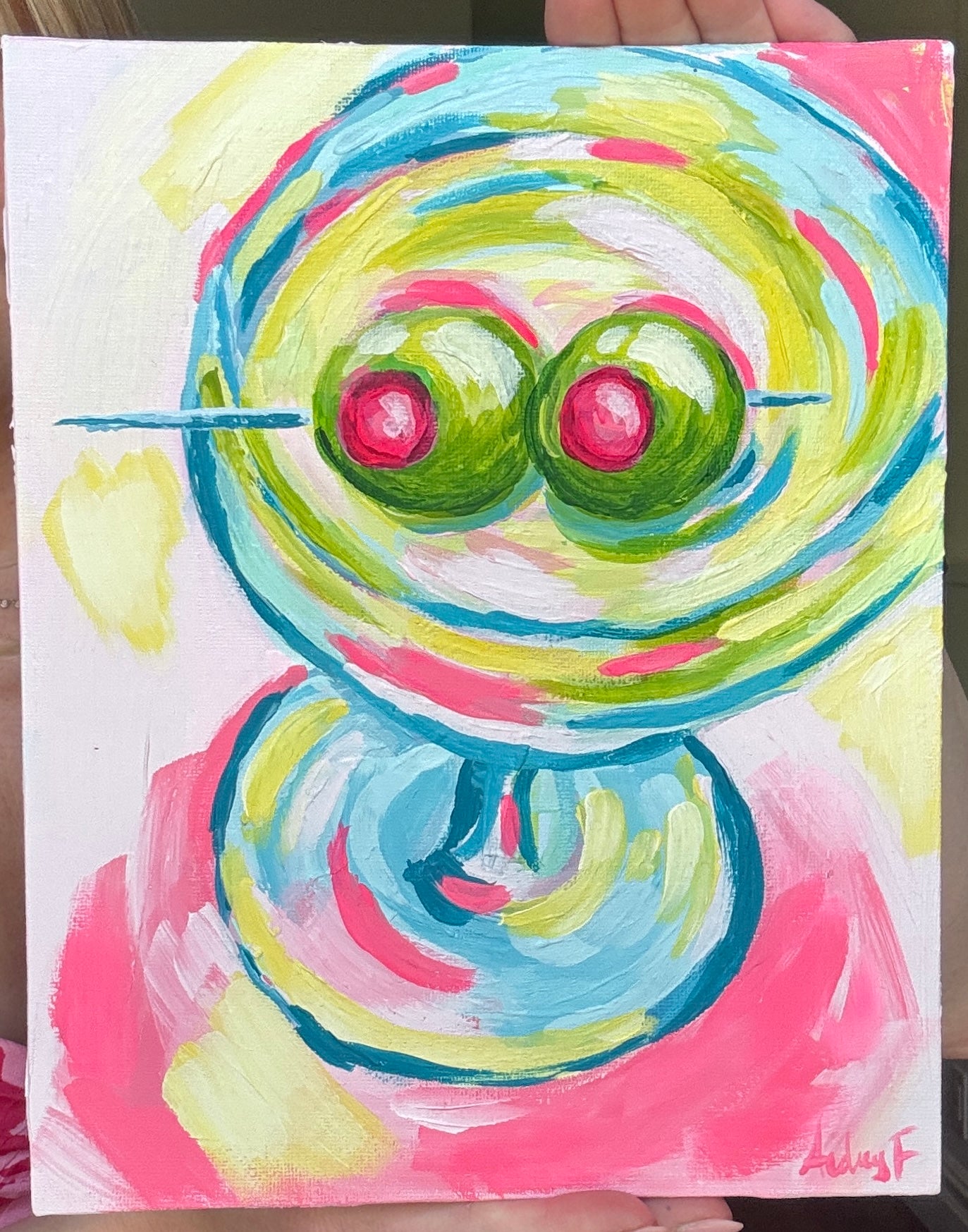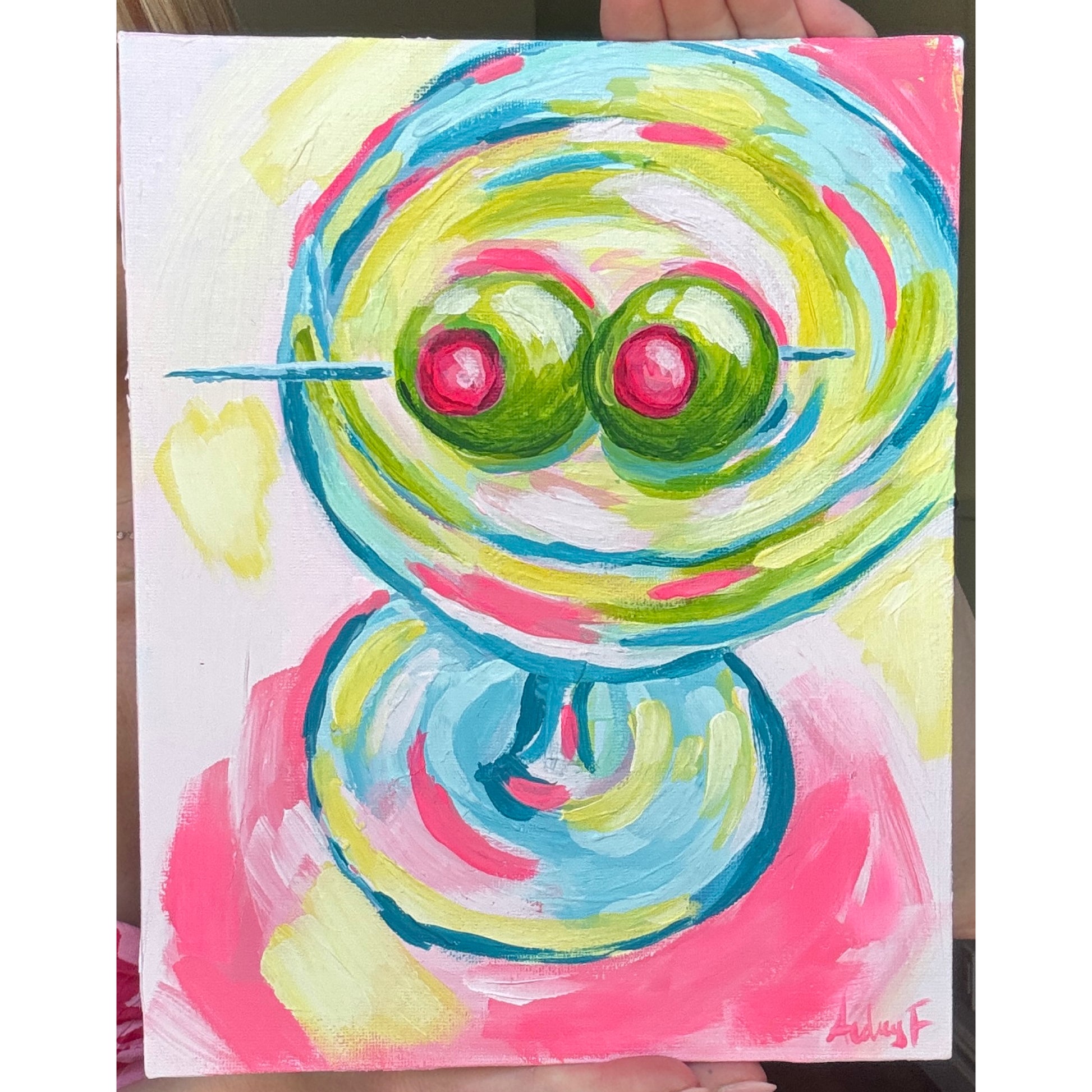 Bold, bright, and ready to party—this abstract martini glass painting features a vivid swirl of neon lime green, aqua blue, and punchy pink, with two juicy green olives front and center. Hand-painted on canvas, this one-of-a-kind 8”x10” artwork adds a playful, retro-chic pop to bar carts, kitchen walls, or gallery-style displays.