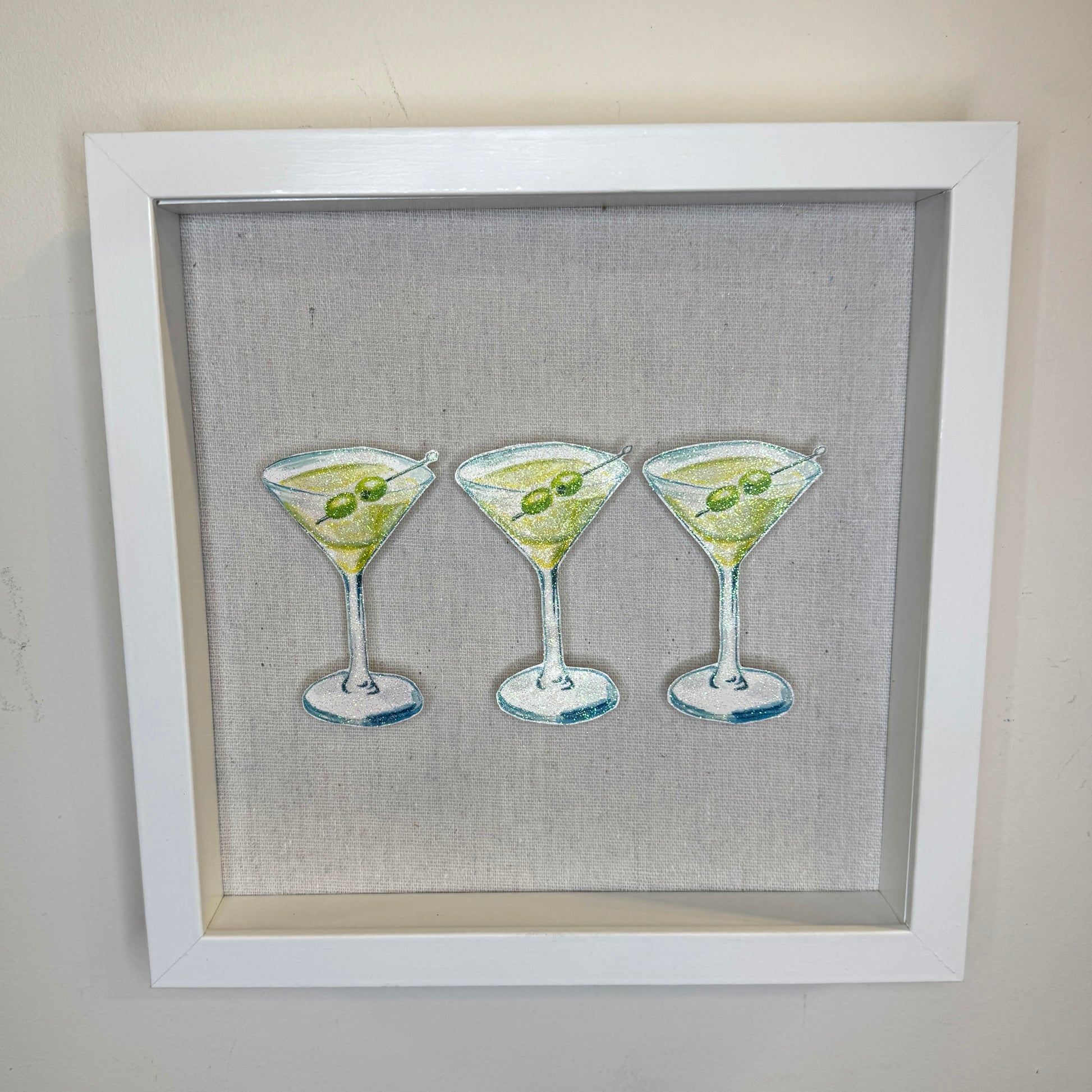 One of Audrey’s most popular watercolors reimagined. Each martini is embellished by hand with ultra-fine iridescent glitter that shines with tiny hints of green. sealed with an acrylic gloss to minimize shedding.
