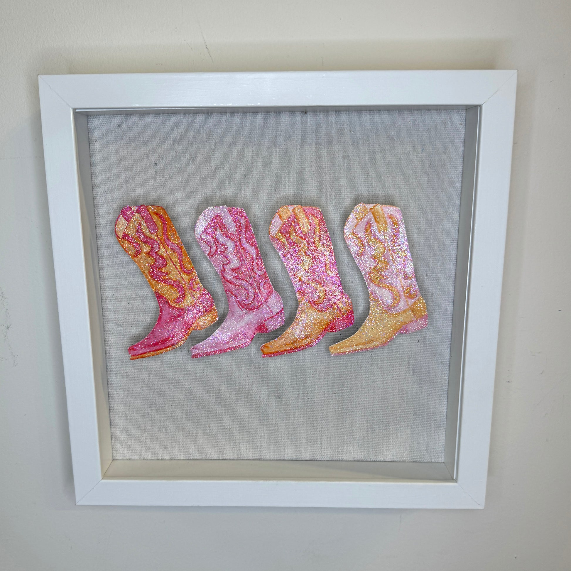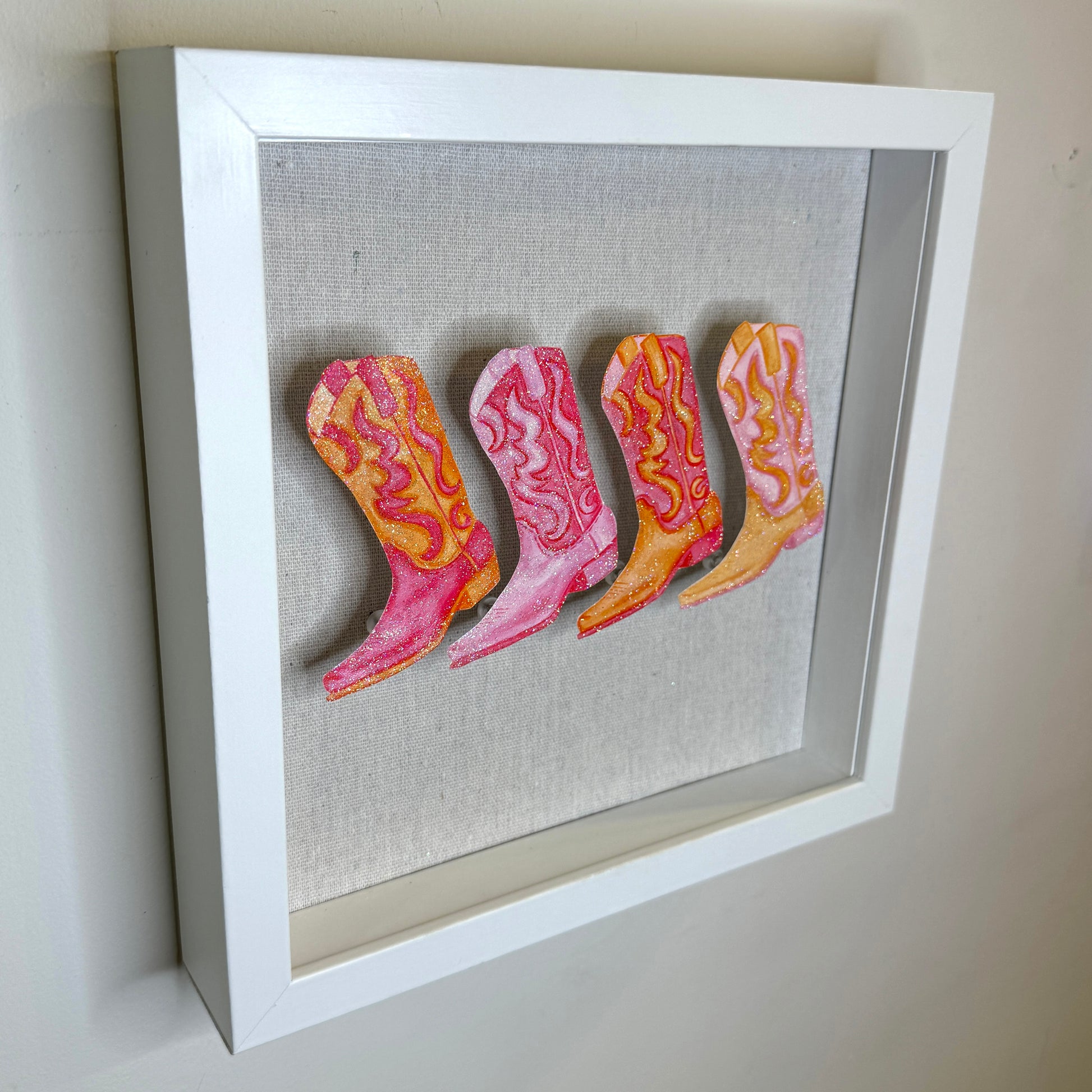 9” x 9” Glitter Embellished Hot Pink & Orange Cowboy Boots 3D Push Pin Shadow Box