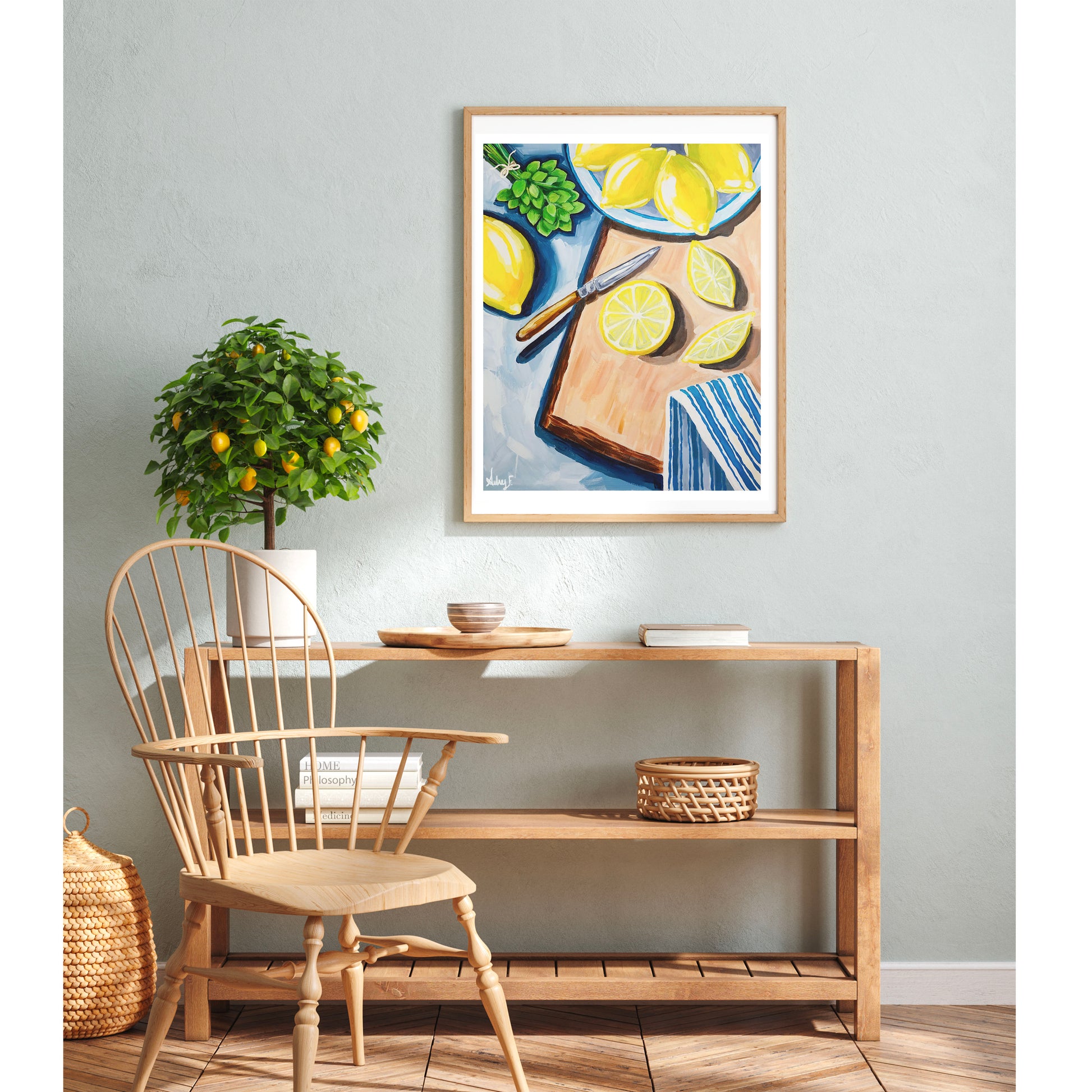 Brighten your space with this fresh and uplifting lemon still life art print, reproduced from an original acrylic painting. Bursting with sunlit yellows, crisp blues, and painterly brushstrokes, this artwork captures a beautifully styled kitchen scene—lemons on a cutting board, sliced citrus, a striped tea towel, mint, and a vintage paring knife. The bold color palette and expressive texture add warmth, energy, and a touch of Mediterranean charm to any room.