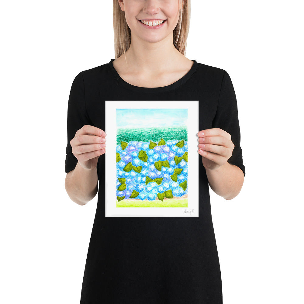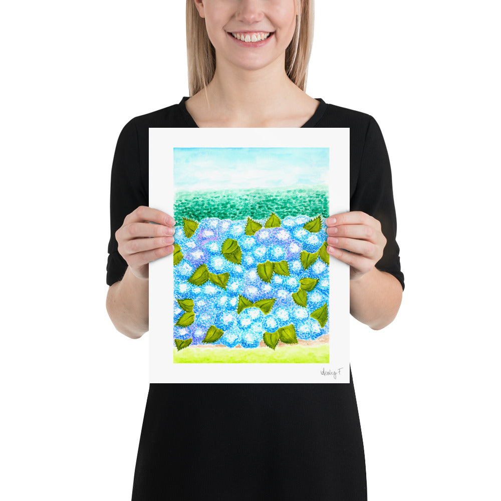 Print | Blue Hydrangea Blooms & Hedge Watercolor | Various Sizes