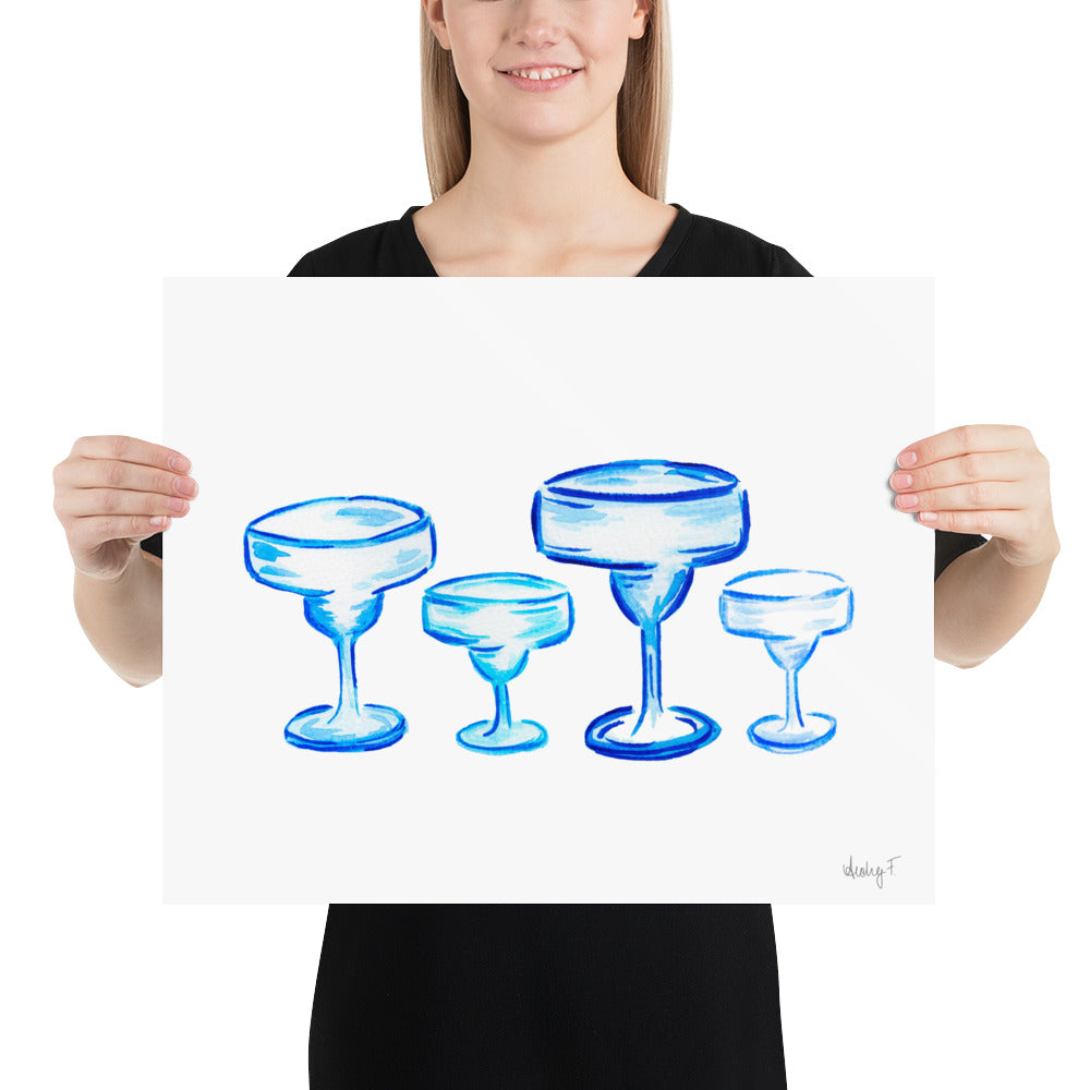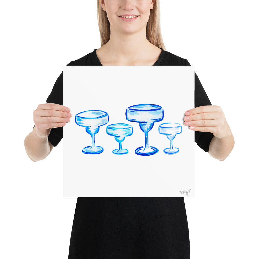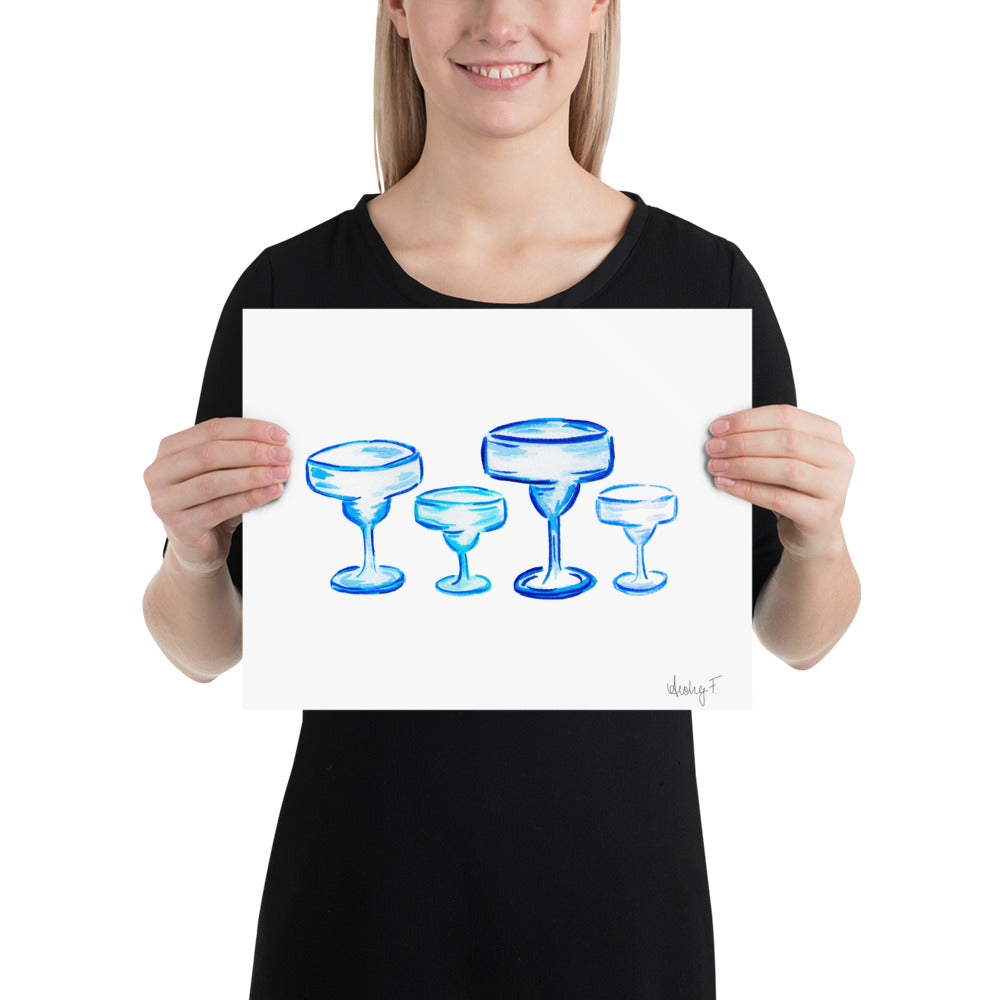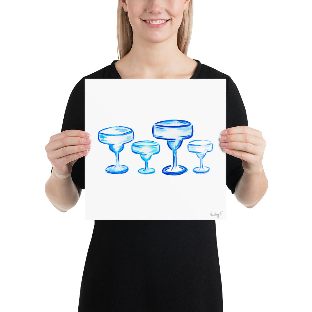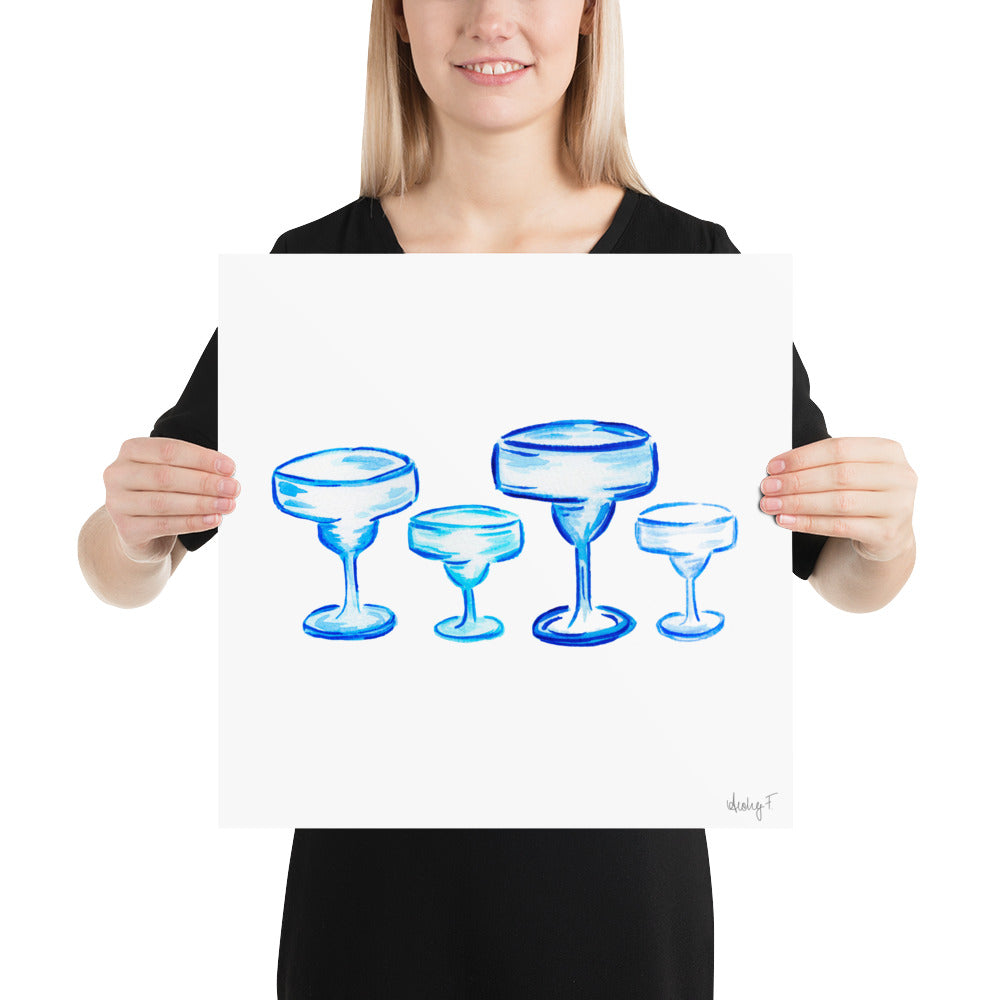 Print | Blue Margarita Glass Watercolor Quad | Bar Cart Cocktail Wall Art | Coastal Grandmother Preppy