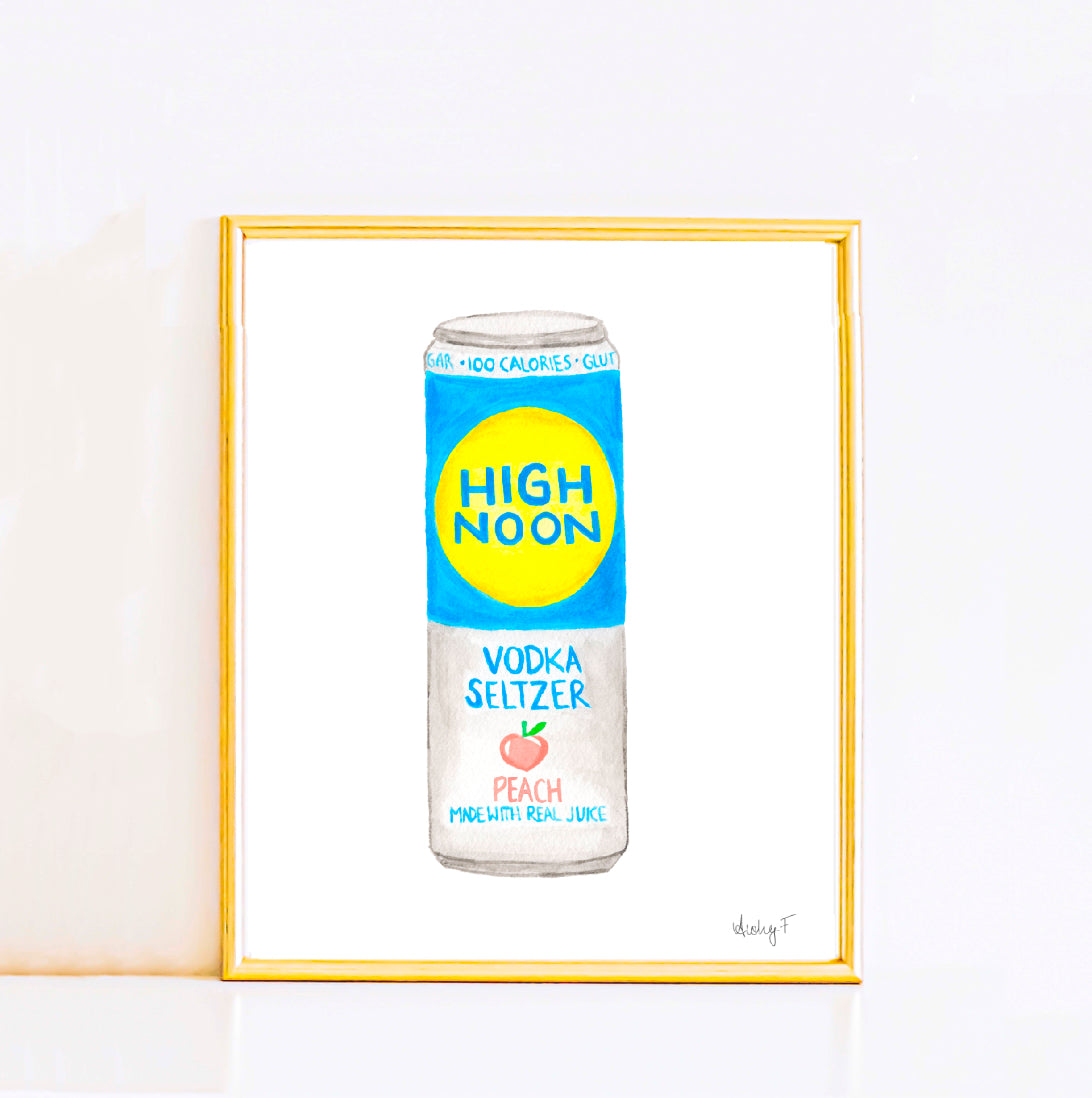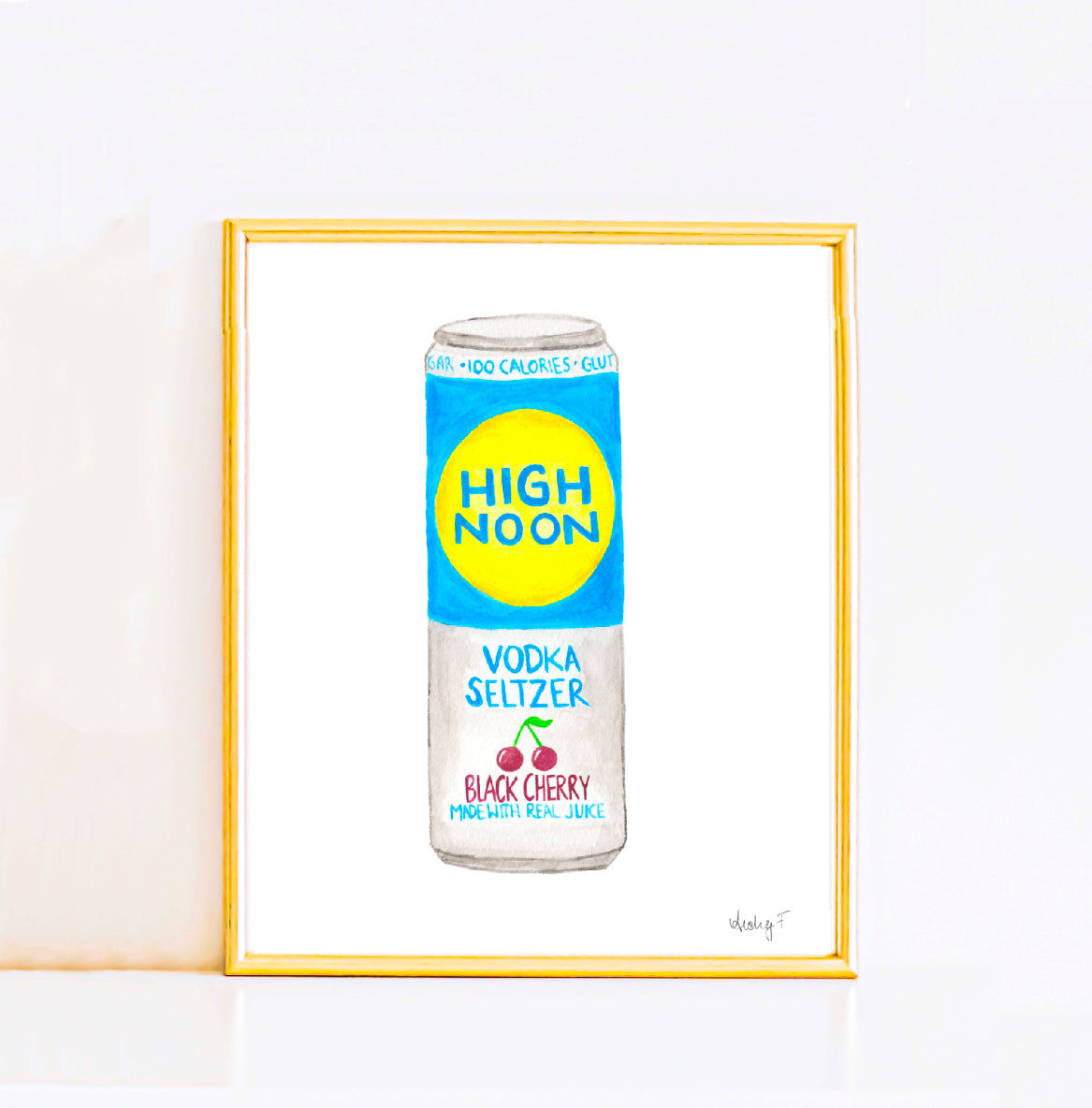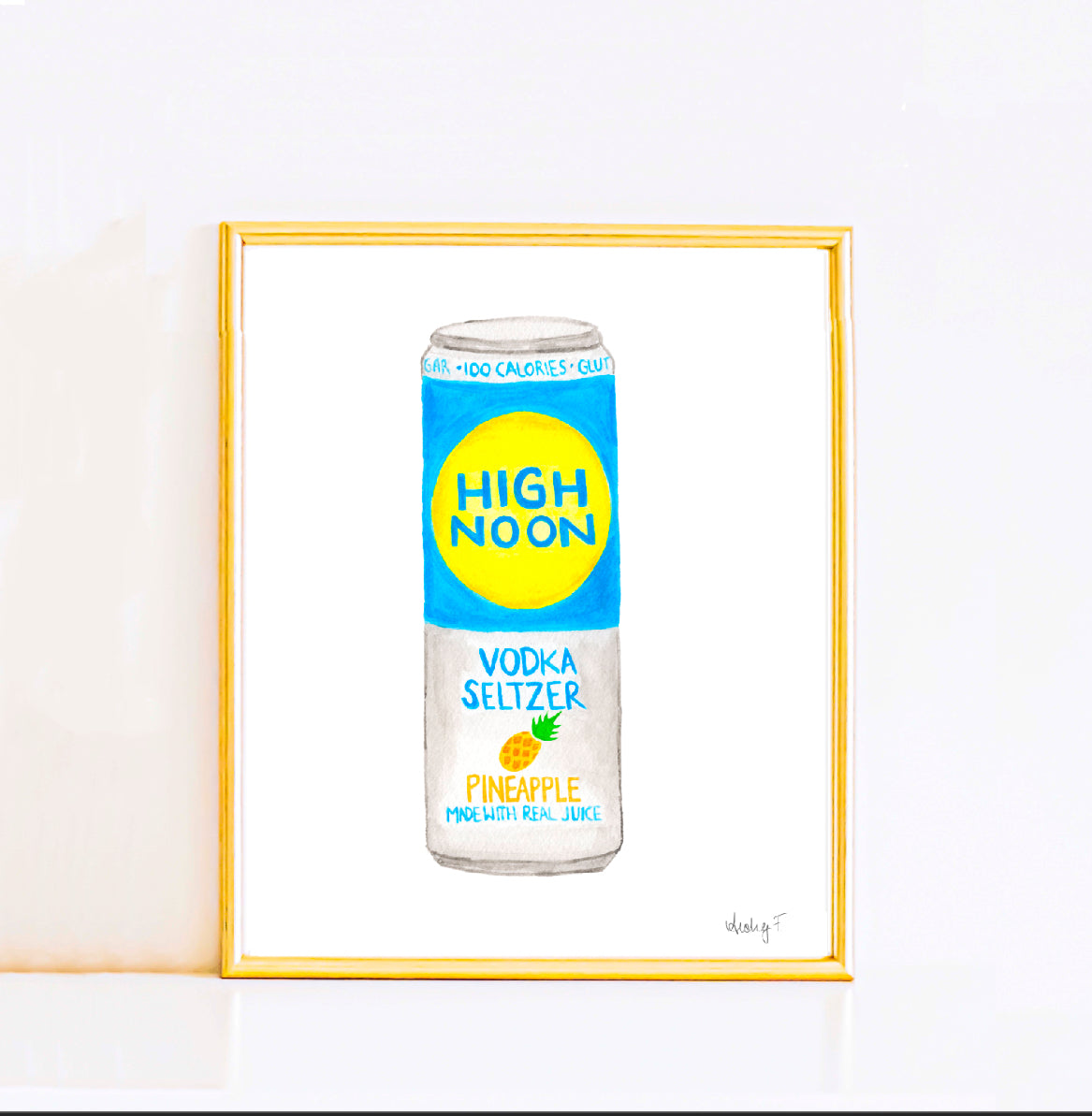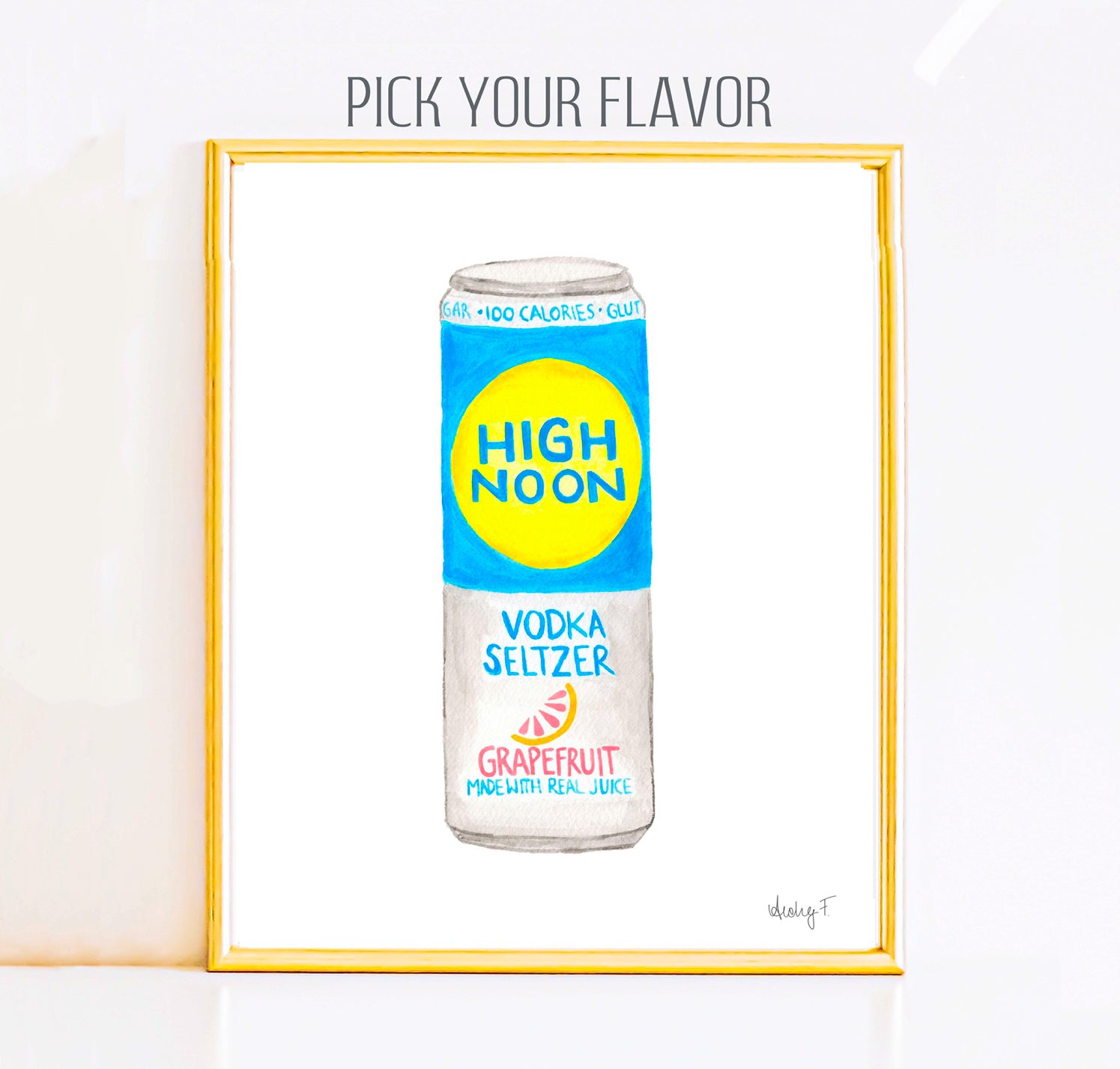 Brighten your space with this delightful watercolor print of a High Noon Vodka Seltzer can in the flavor of your choice. Hand-painted with care, then digitized this piece captures the essence of summer fun and laid-back vibes.