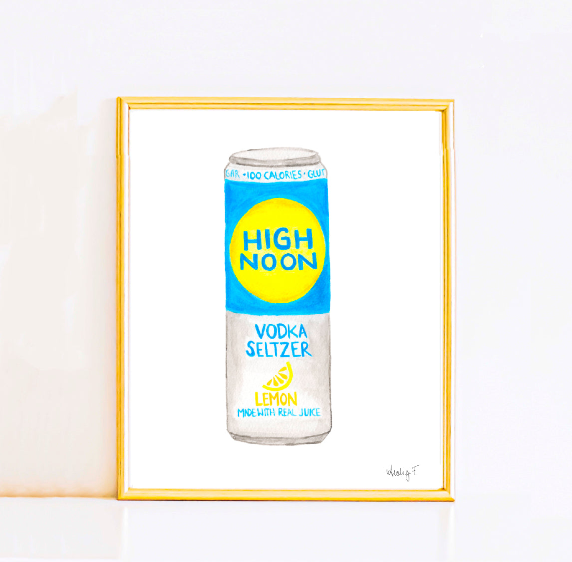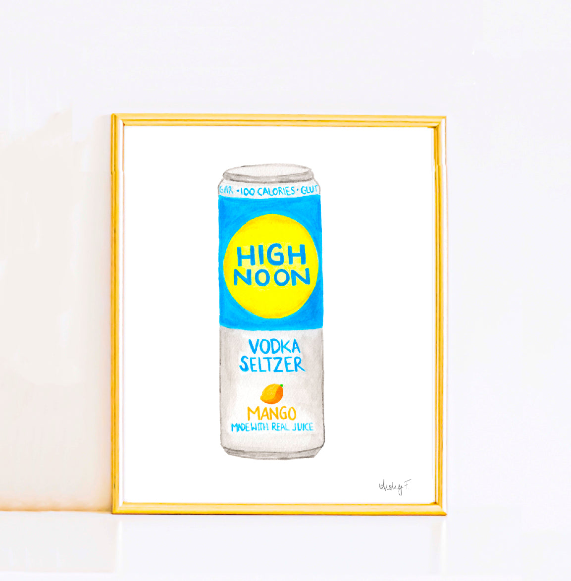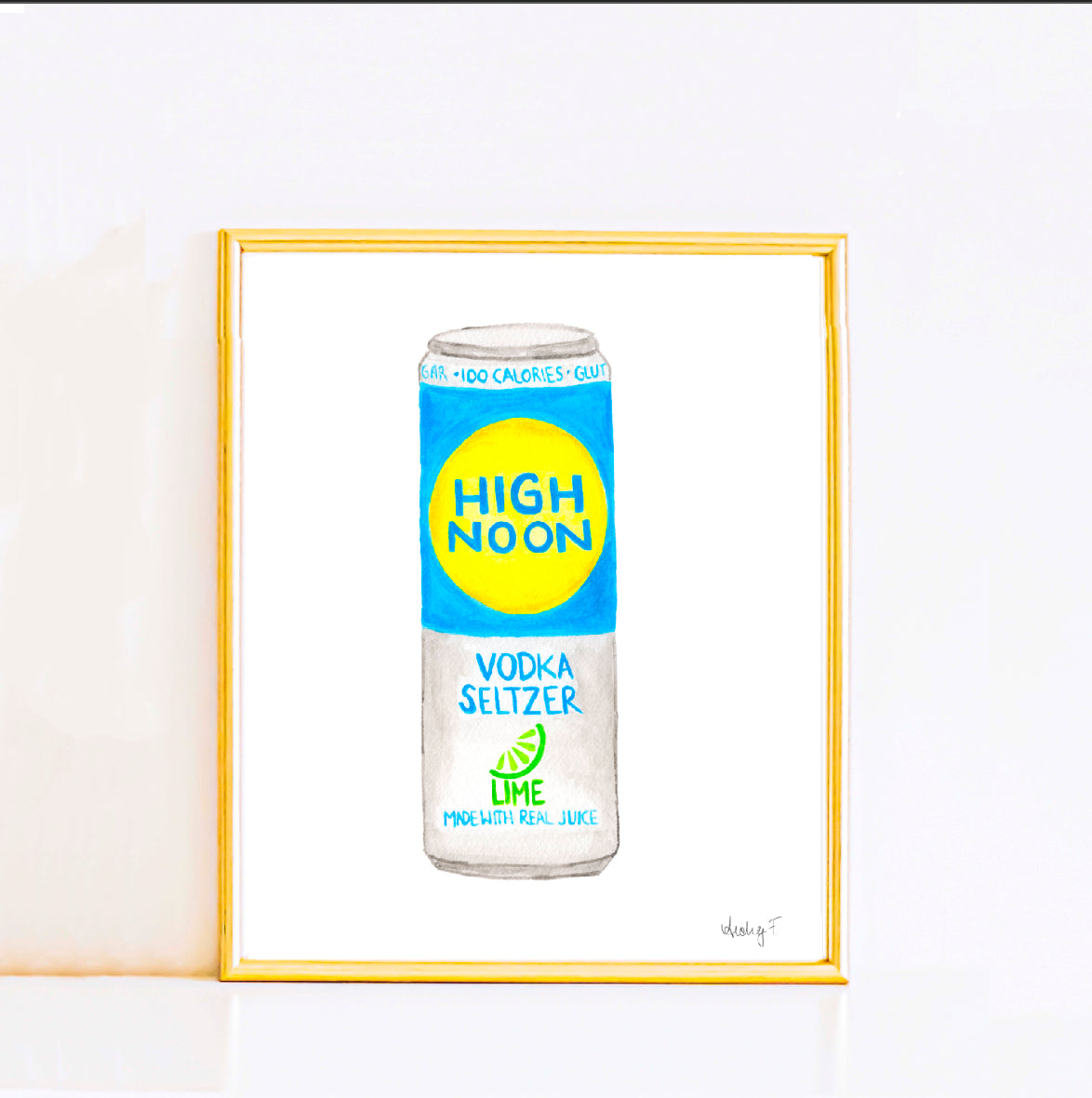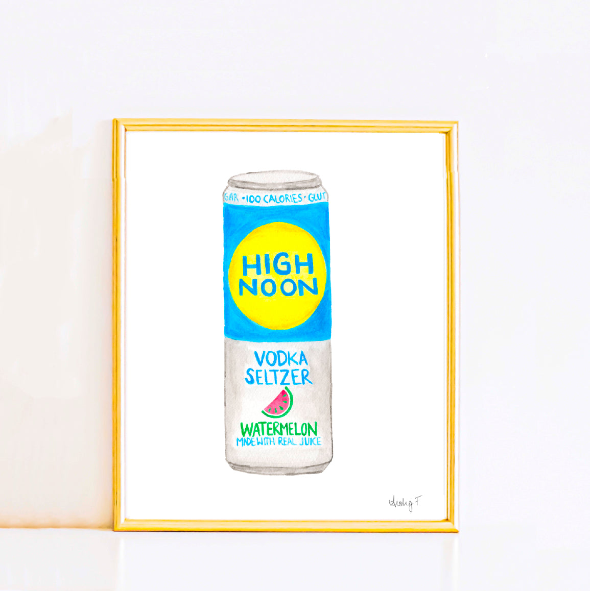 Brighten your space with this delightful watercolor print of a High Noon Vodka Seltzer can in the flavor of your choice. Hand-painted with care, then digitized this piece captures the essence of summer fun and laid-back vibes.