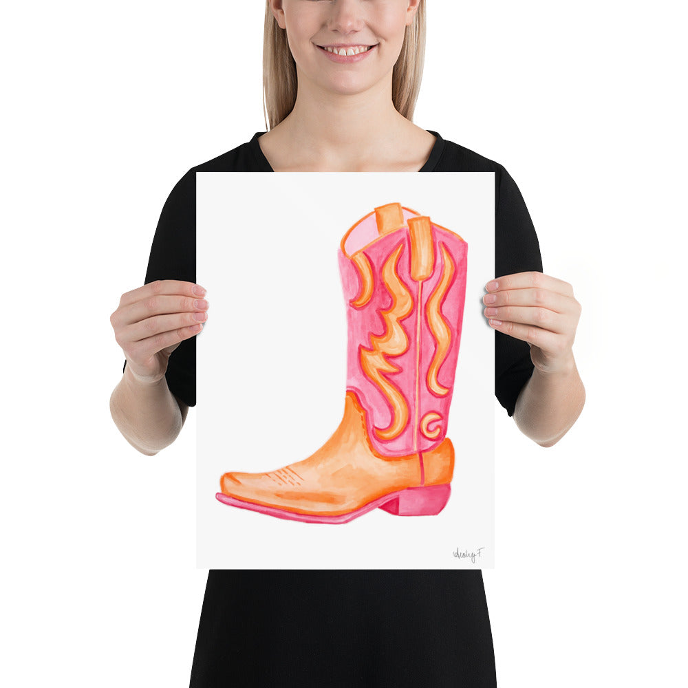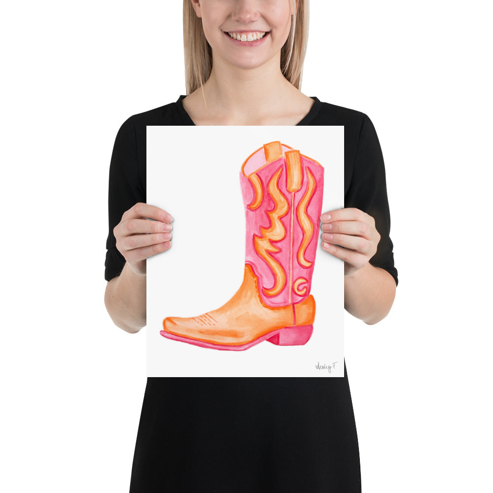 Print | Hot Pink & Orange Cowboy Boot Watercolor | Coastal Cowgirl Southern Rustic Western Colorful Fun Dorm Room Poster Decor