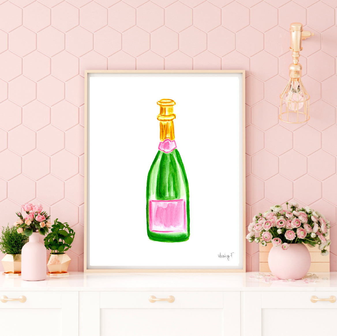 Print | Pink & Green Champagne Bottles Watercolor | Preppy Colorful Cheery Bright Coastal Cowgirl Dorm Cocktail Wall Art Cocktail Bar Cart Poster Decor