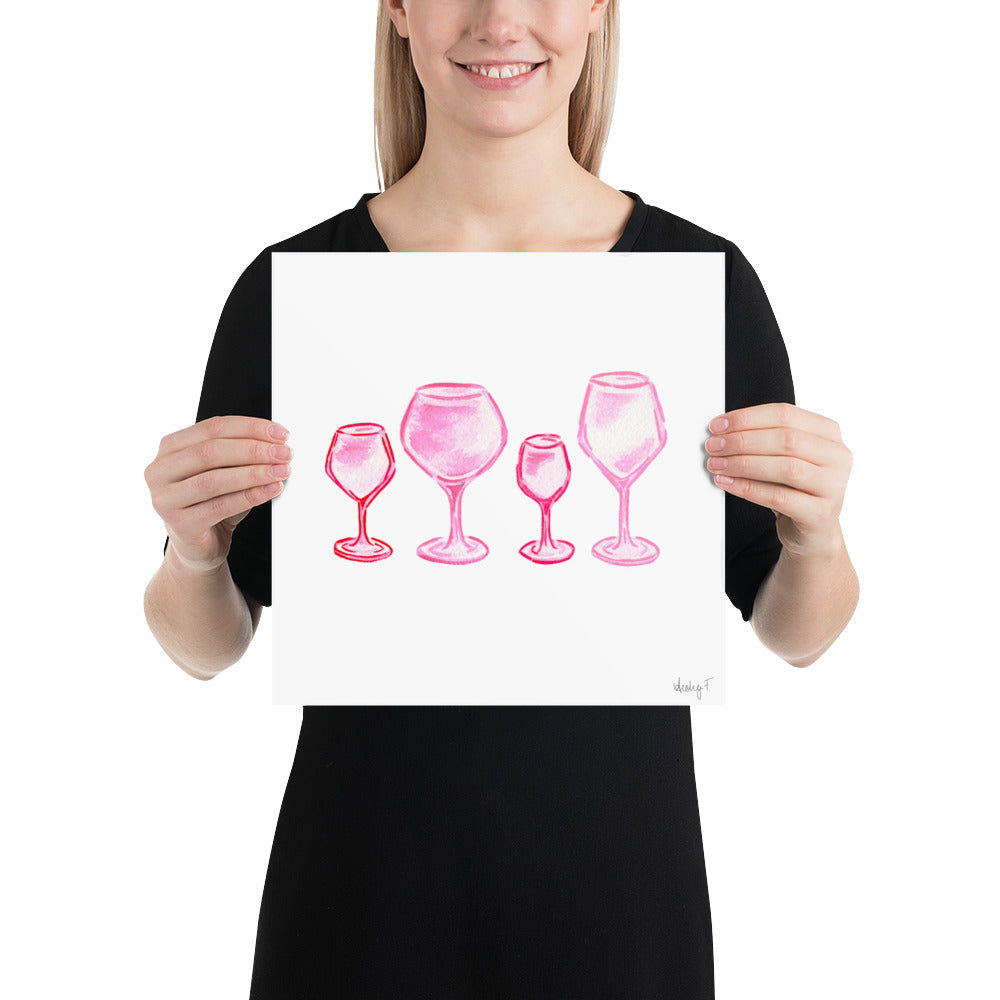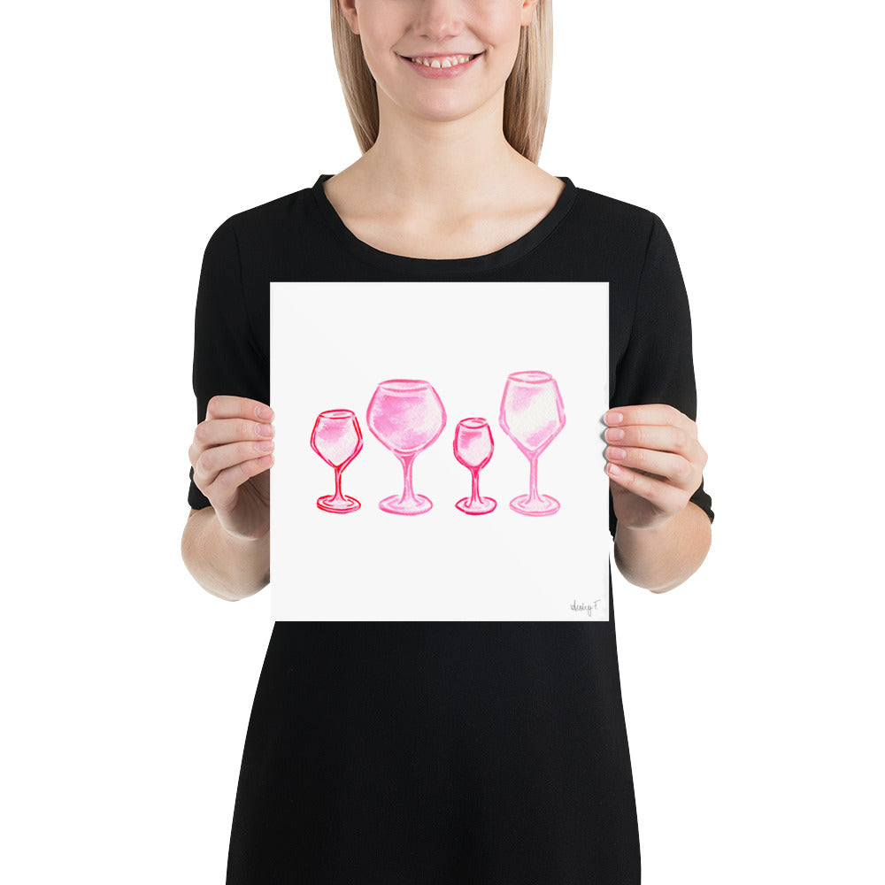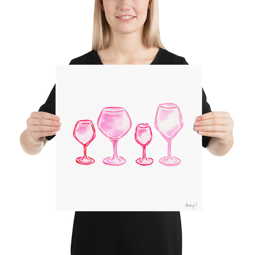 Print Pink Wine Glasses Watercolor Quad | Bar Cart Art Cocktail Wall Poster Kitchen