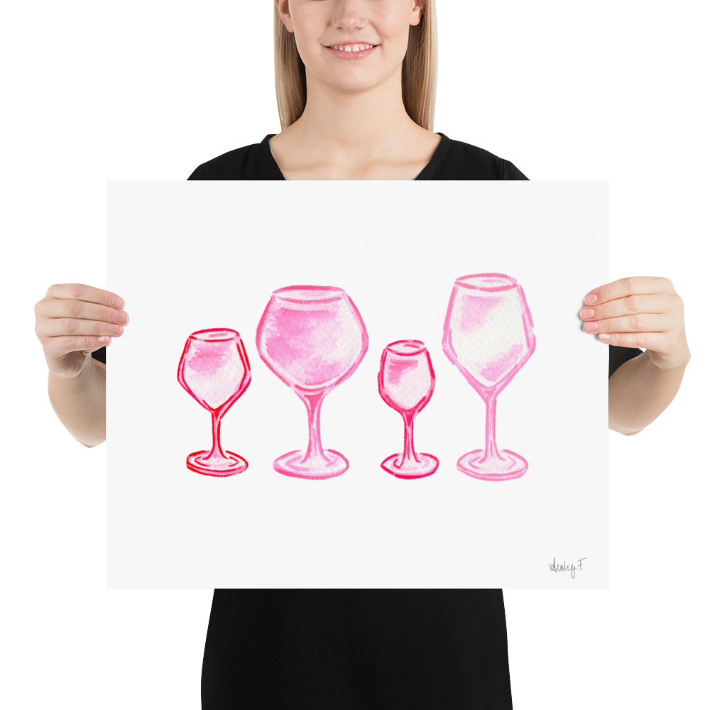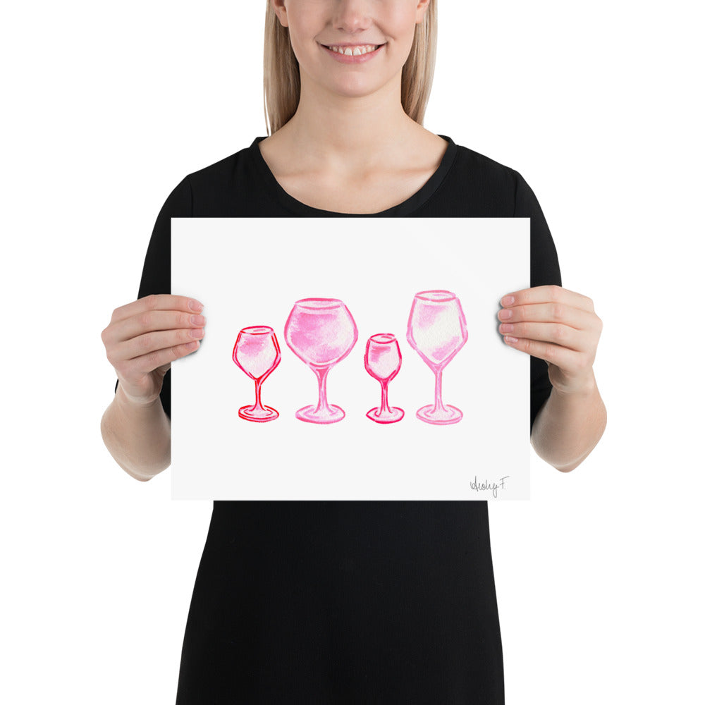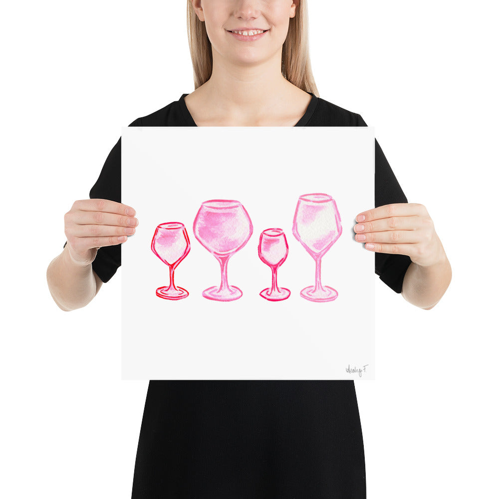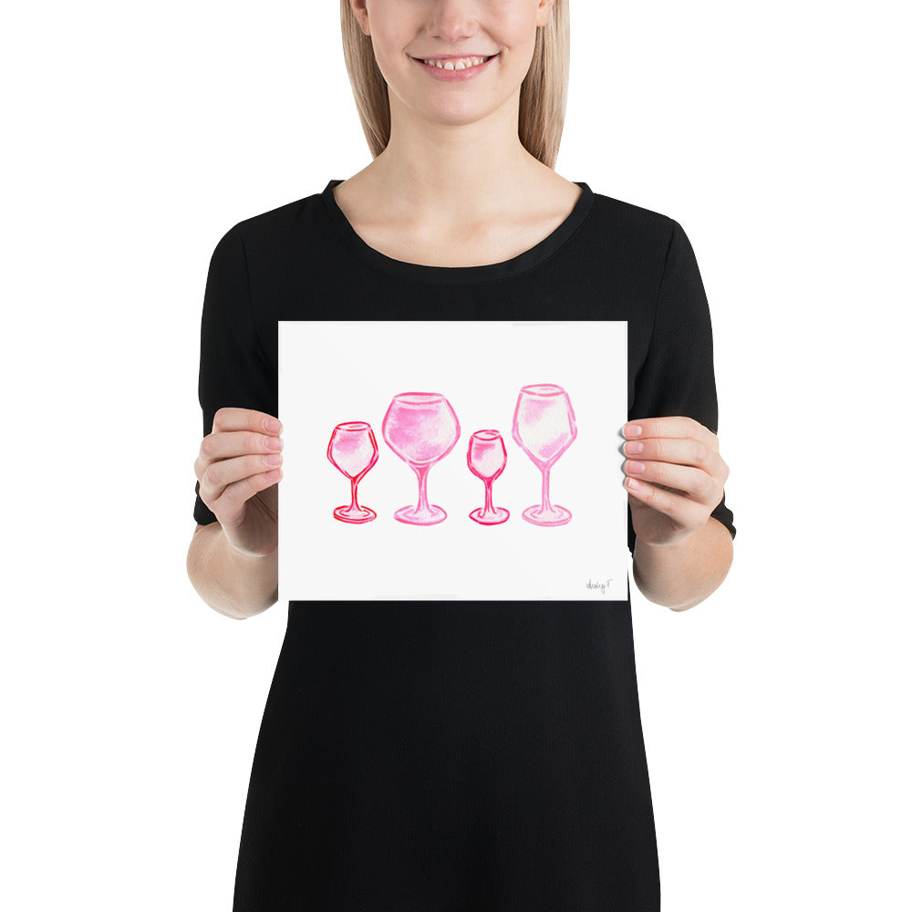 Print Pink Wine Glasses Watercolor Quad | Bar Cart Art Cocktail Wall Poster Kitchen
