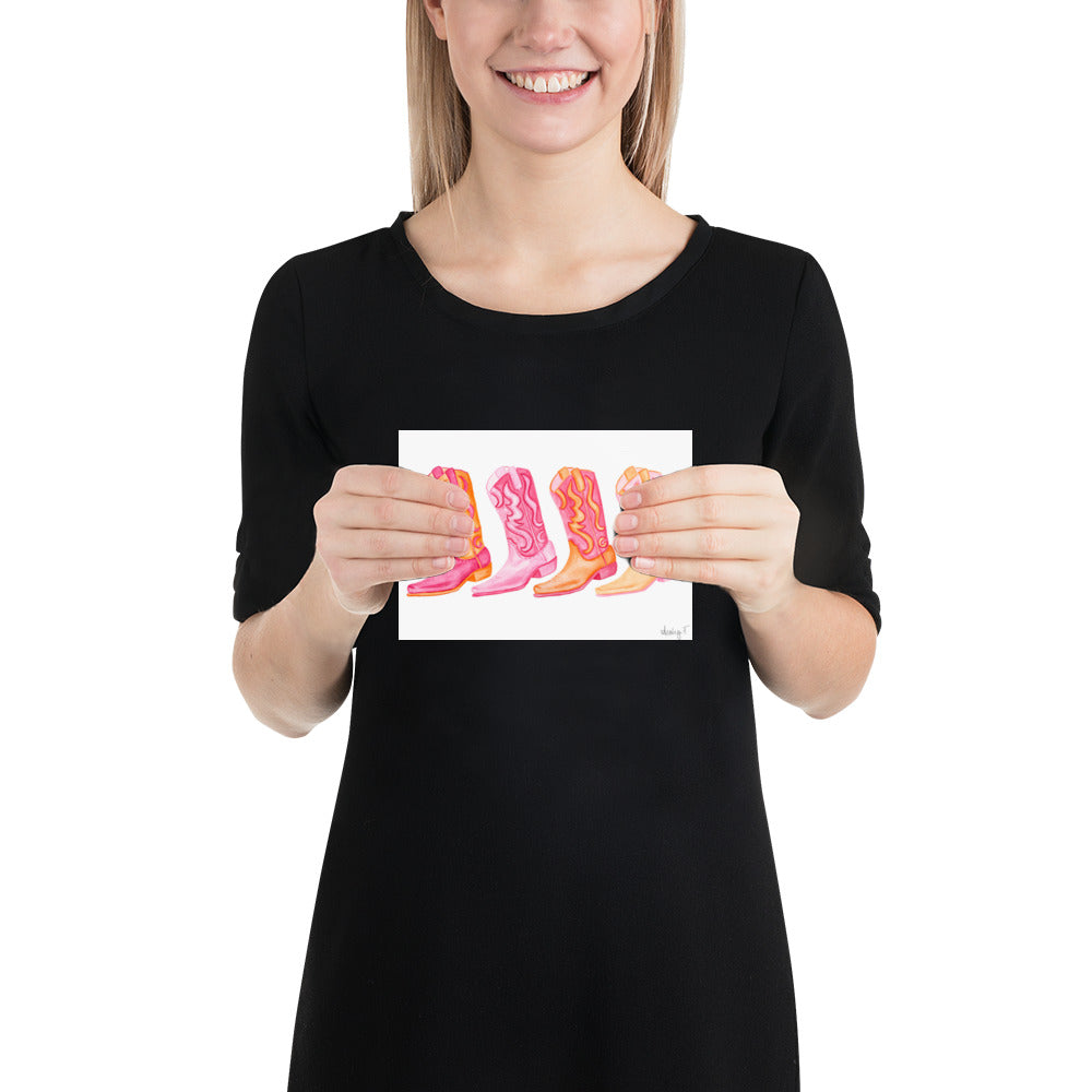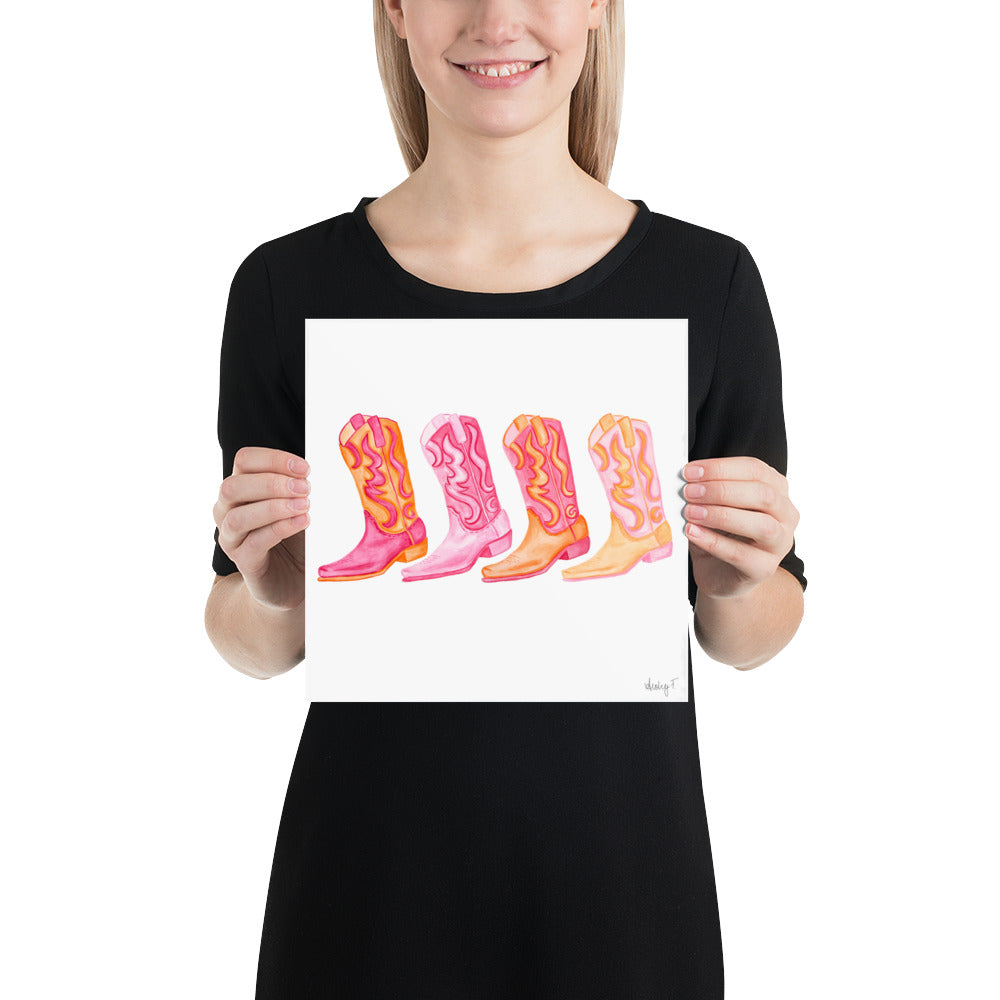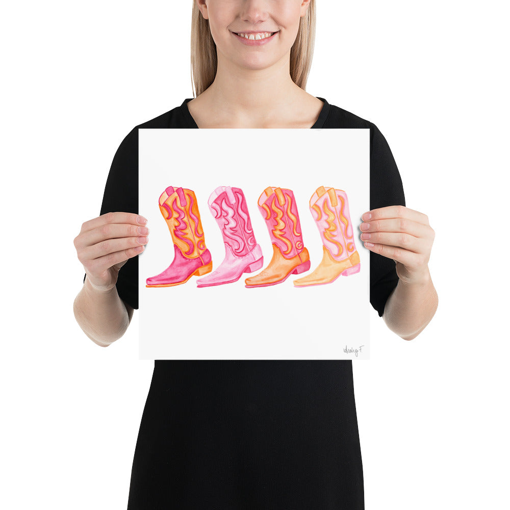 Add a pop of Southwestern charm to your space with this vibrant watercolor print of four cowboy boots in bold pink, orange, and coral hues. Perfect for country lovers, modern ranch aesthetics, or anyone seeking a playful and colorful wall art piece. Browse now to bring home this unique piece of Western-inspired decor!